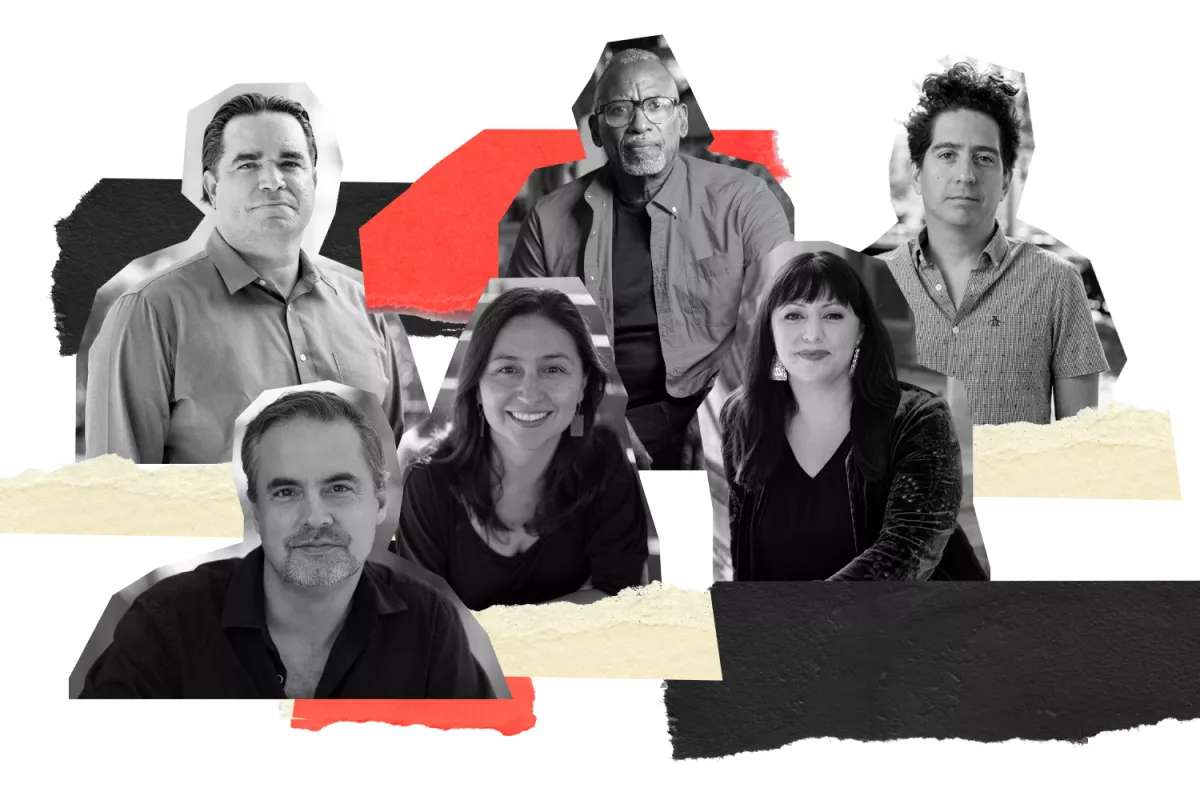 Victor J. Torres, left, Alex Rivera, Cristina Ibarra, Daniel Lind-Ramos, Monica Muñoz Martinez and Daniel Alarcón.(Photo illustration by Martina Ibáñez-Baldor / Los Angeles Times; photos by John D. and Catherine T. MacArthur Foundation)