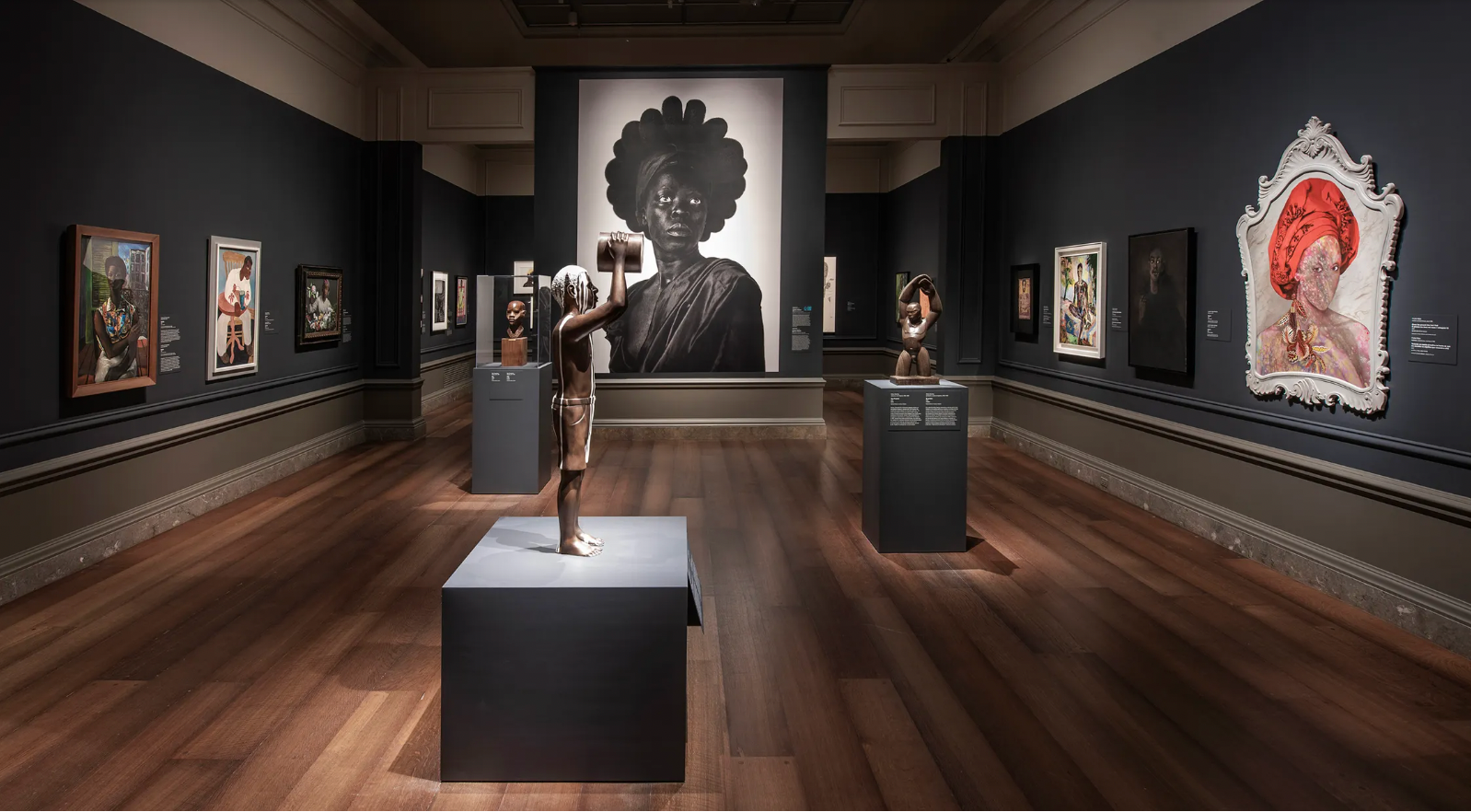 Zanele Muholi’s self-portrait “Ntozakhe II, (Parktown),” rear center, overlooks a room in the National Gallery’s “Afro-Atlantic Histories” exhibit.Photograph courtesy National Museum of Art