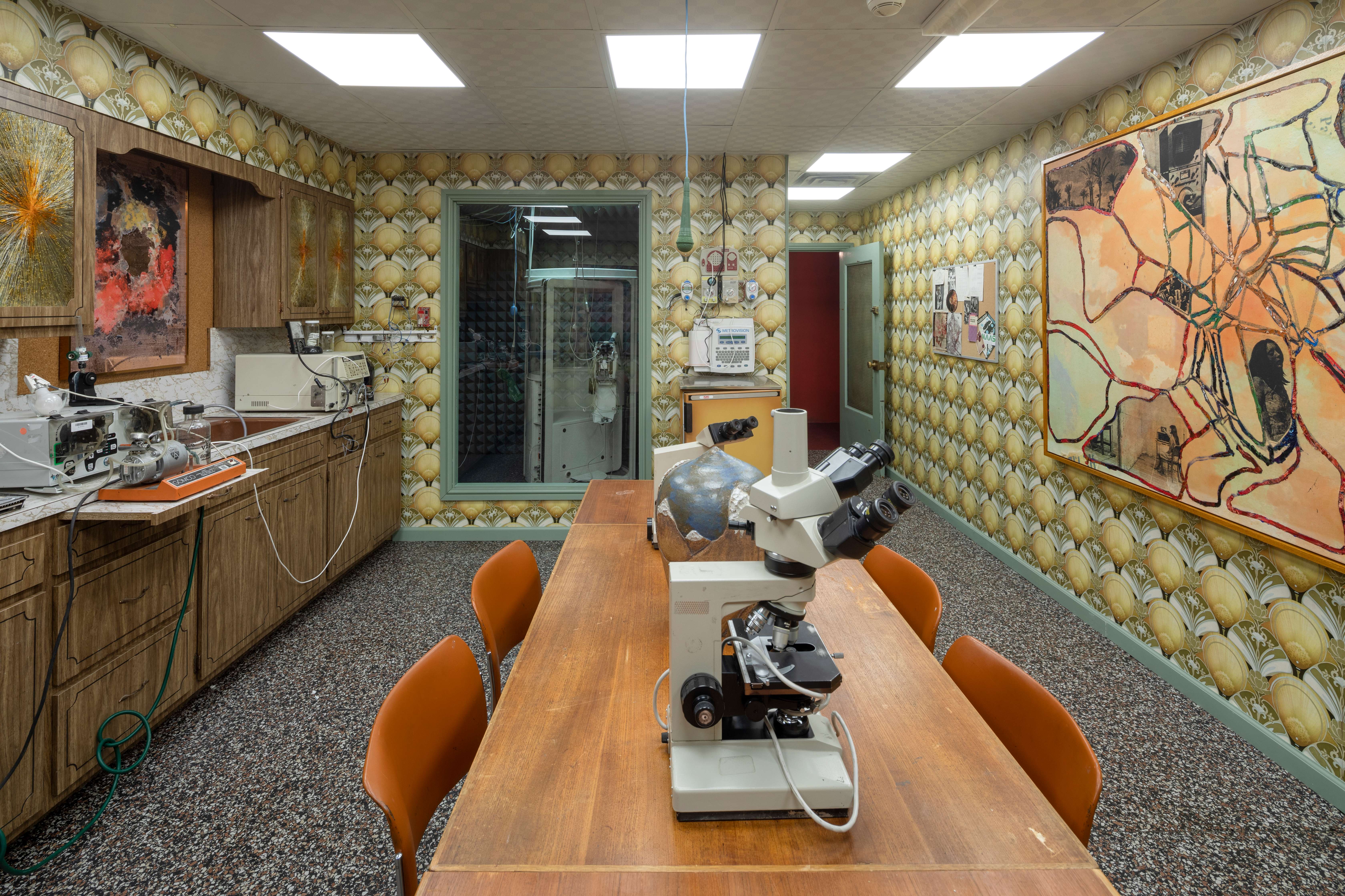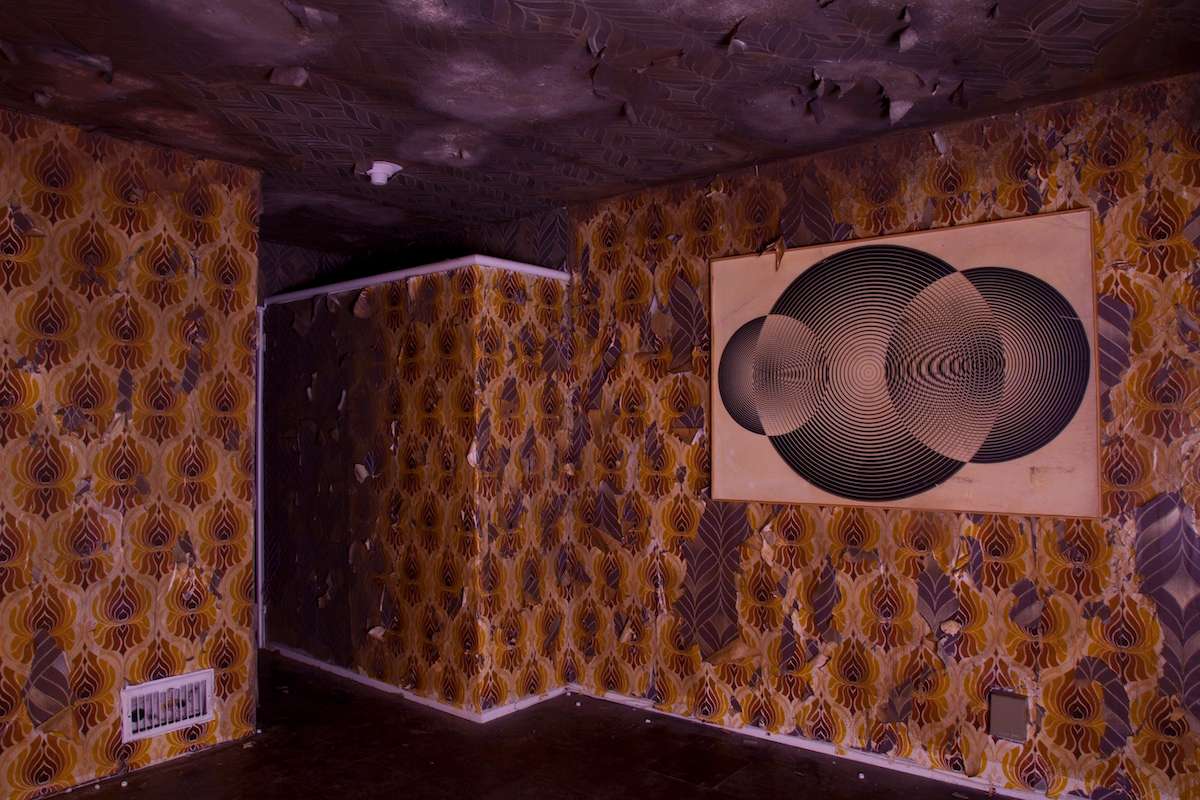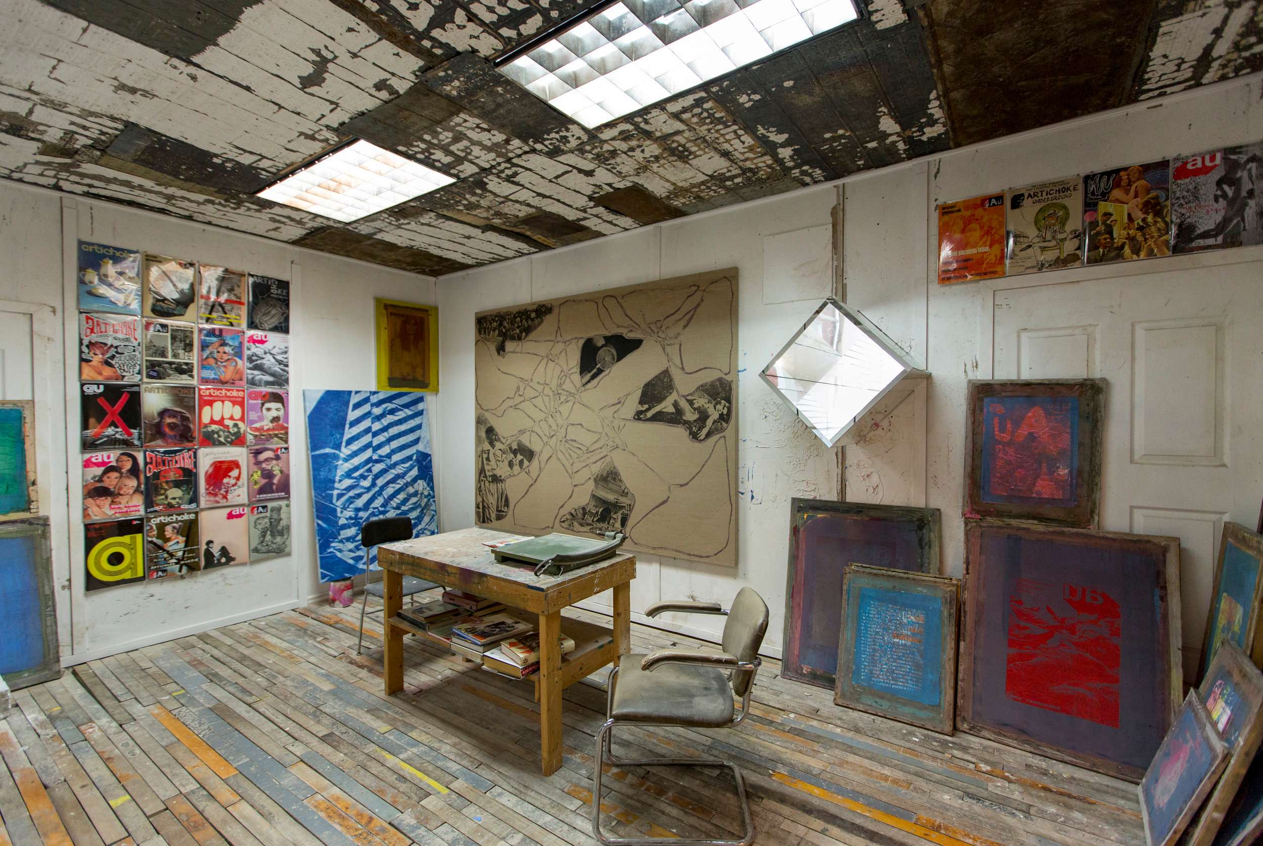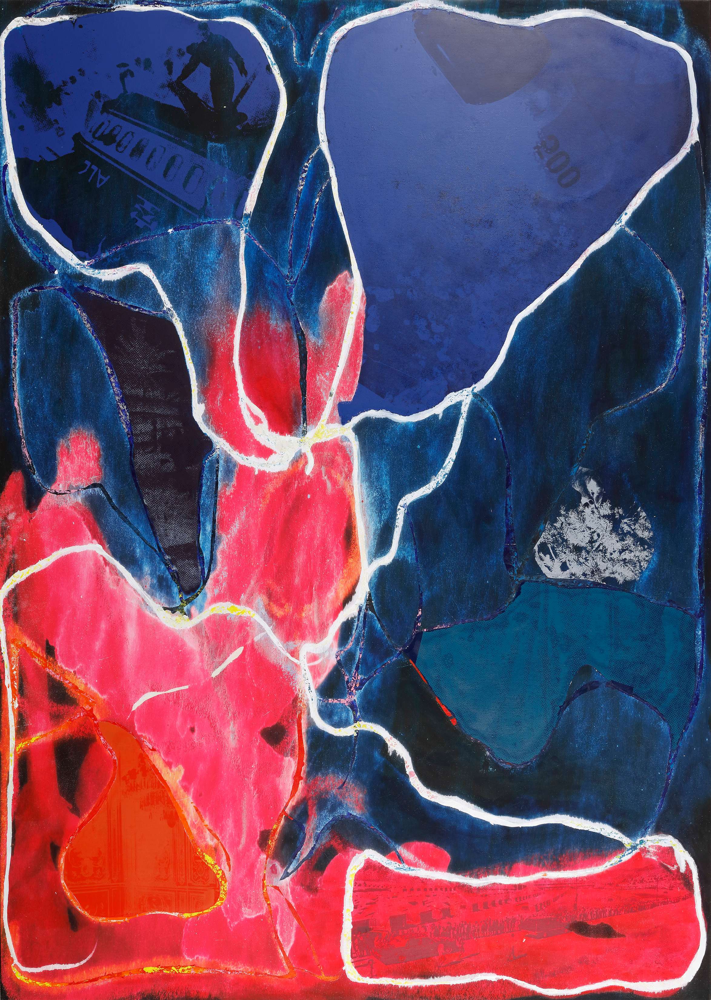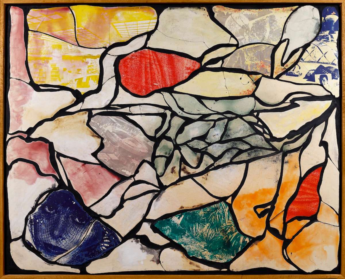 A Drunk Host and Hypoallergenic Pillows [From Colony Sound], 2019. Encaustic wax, silkscreen, spray paint and ink on canvas, 55 1/2 x 78 inches, 141 x 198.1 cm