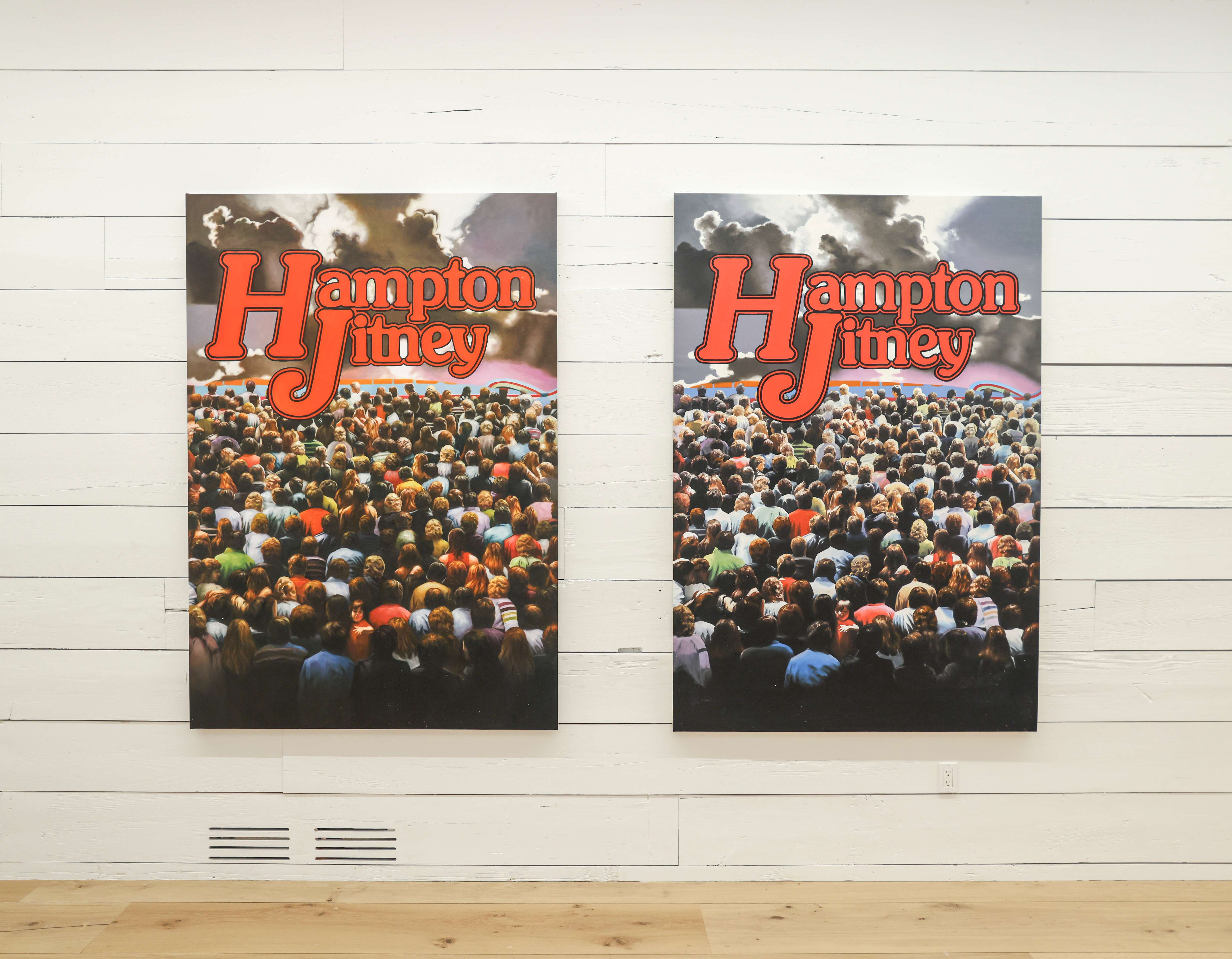 Jamian Juliano-Villani, Running on the bulls #1, 2022. Oil on canvas 77 x 53 ” (195.6 x 134.6 cm) and Running on the bulls #2, 2022. Oil on canvas 77 x 53 ” (195.6 x 134.6 cm)