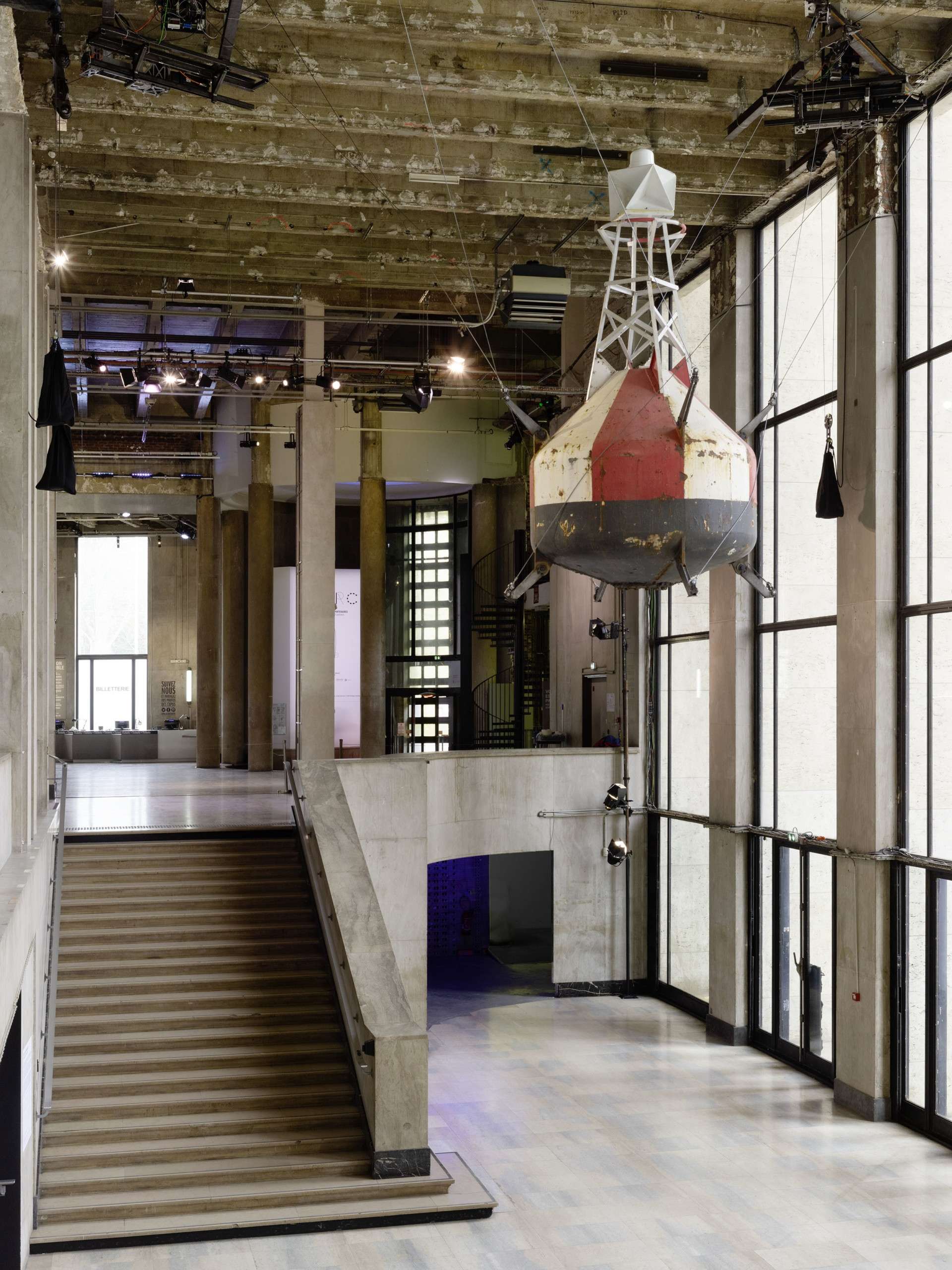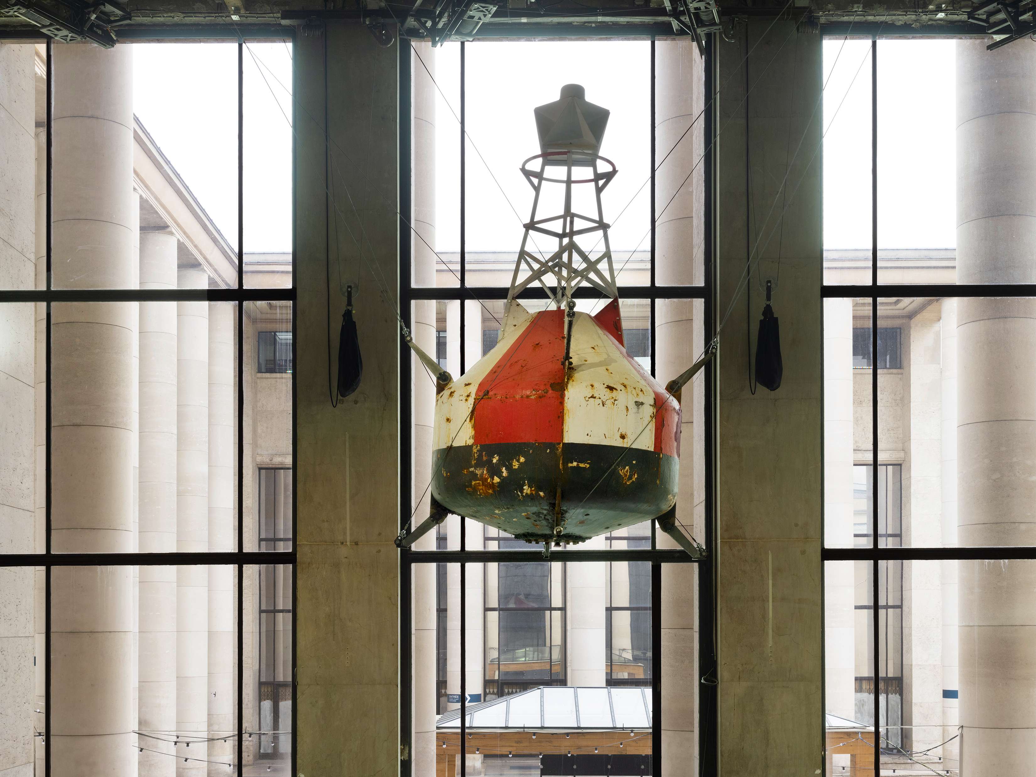Inspired by the figure of Tethys – a sea goddess in Greek mythology, the daughter of the sky (Ouranos) and of the earth (Gaia) – Julius von Bismarck has conceived the original project “Die Mimik der Tethys” (the expressions of Tethys), for which he has moved the oceans. That is at least the sensation produced by the presence of a buoy hung over the Palais de Tokyo’s Palier d’honneur, corroded by sea salt and covered by dry seaweed. In perpetual motion, the buoy reproduces the movements of its original setting, off the Atlantic coast. It is in this way that the visitors find themselves metaphorically under the ocean, and can directly perceive the sway of its waves, which can be either gentle, or wild. The artist works on the human perception of natural phenomena, either by using highly technical approaches, or by simple site specific gestures. As he puts it: “it’s about the perfect image we have of nature. In reality, it doesn’t look like we imagine it does in a Caspar David Friedrich pastoral painting.” The astonishing sensation created by his moving buoy does indeed depict a misappropriated or modified vision of nature, transforming the building into a submarine world, paced by a giant pendulum that obeys only itself. “Die Mimik der Tethys” works like a barometer of nature’s moods. As a random alternation of moments of calm and violence, this hypnotic installation plunges the visitors into the heart of an immersive relationship with nature. Far from being idealised, it takes over the Palais de Tokyo and is unveiled in an extremely unstable way, a tireless heaving that reminds us of the tender osmosis that links us, just like our vain desire to control our environment, with the risk of utterly destroying it.