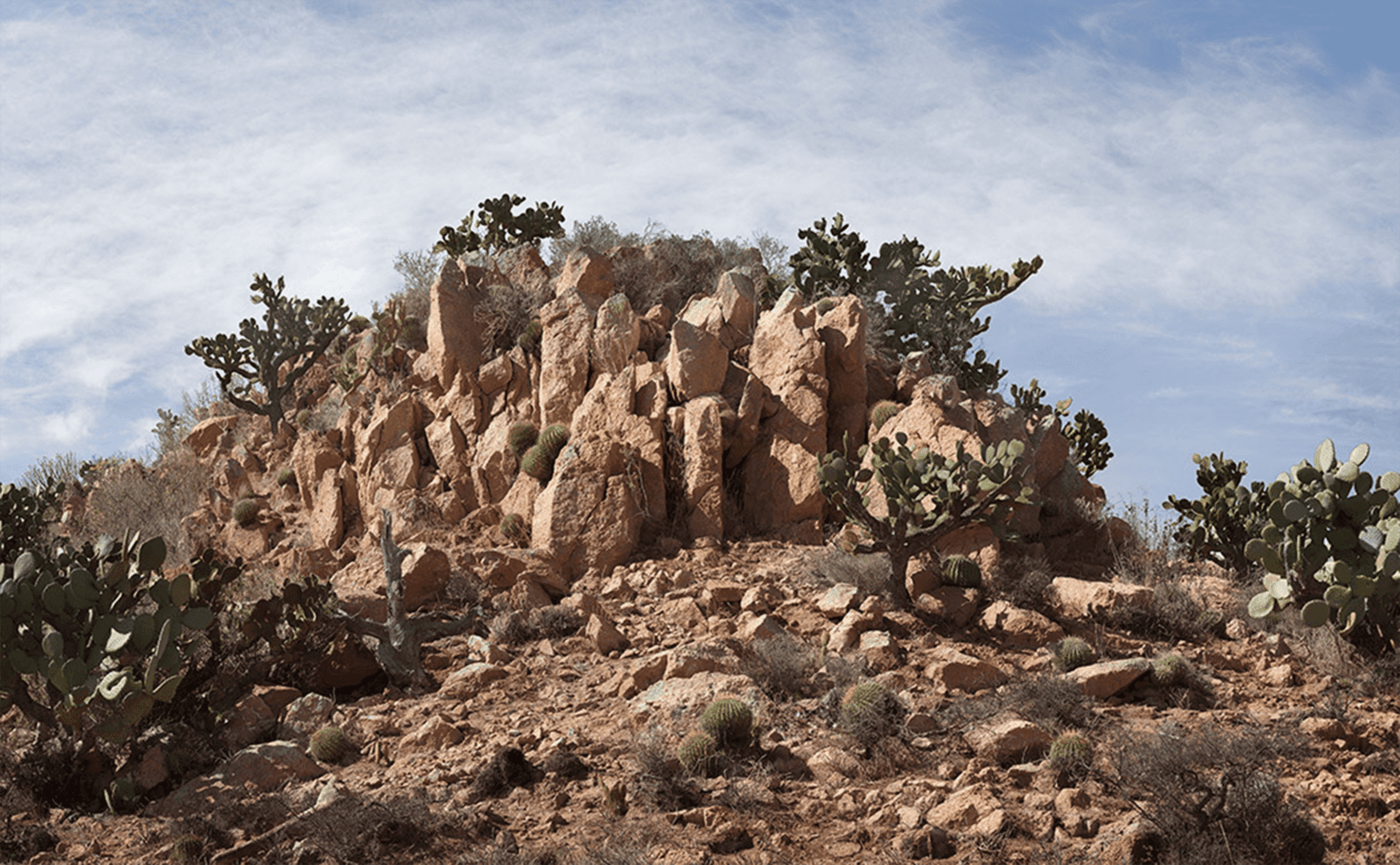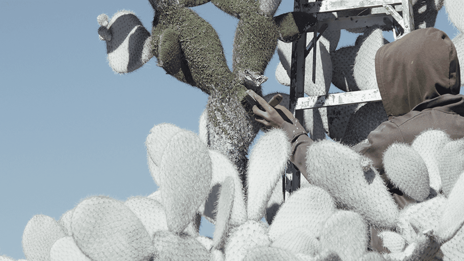 Landscape Painting shows painted landscapes—a desert scene with cacti and rocks and a jungle scenario. The artist traveled to two locations in Mexico, where he selected an appropriate segment of land and organized a team of local helpers. He paid these helpers to first paint the landscape white and then to overpaint the landscape again in its original colors with acrylic paint. These painters reconstructed the colors of their local surroundings from memory. The photographs resulting from this intervention are composed of multiple detail views and thus result in extremely high-resolution images (> 400 MPx). Upon closer examination, one can find the layer of acrylic paint that covers leaves, thorns, sand, and other aspects of the landscape. Since only these surfaces are visible, essentially all that one sees is plastic in the form of an acrylic coat of paint. These two painting processes are each documented by thirty-minute videos. In the jungle, Maya Indians paint various green tones onto the whitened environment, leaf by leaf. In the desert, local agricultural workers paint the stony cactus-covered landscape over a period of seven days.