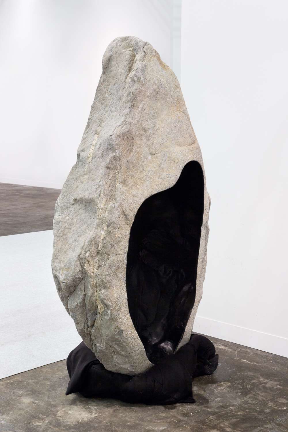 Boulder II, 2017. Hollowed boulder, carbon fibers, sandbag, concrete, 63 × 35 3/8 × 23 5/8 inches