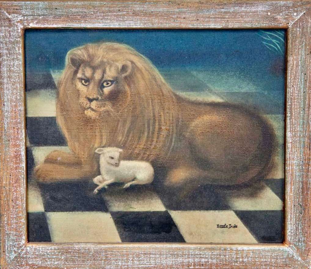 Untitled (Lion and Lamb), c. 1970s. Oil on panel, 10 1/2 x 12 1/2 inches.