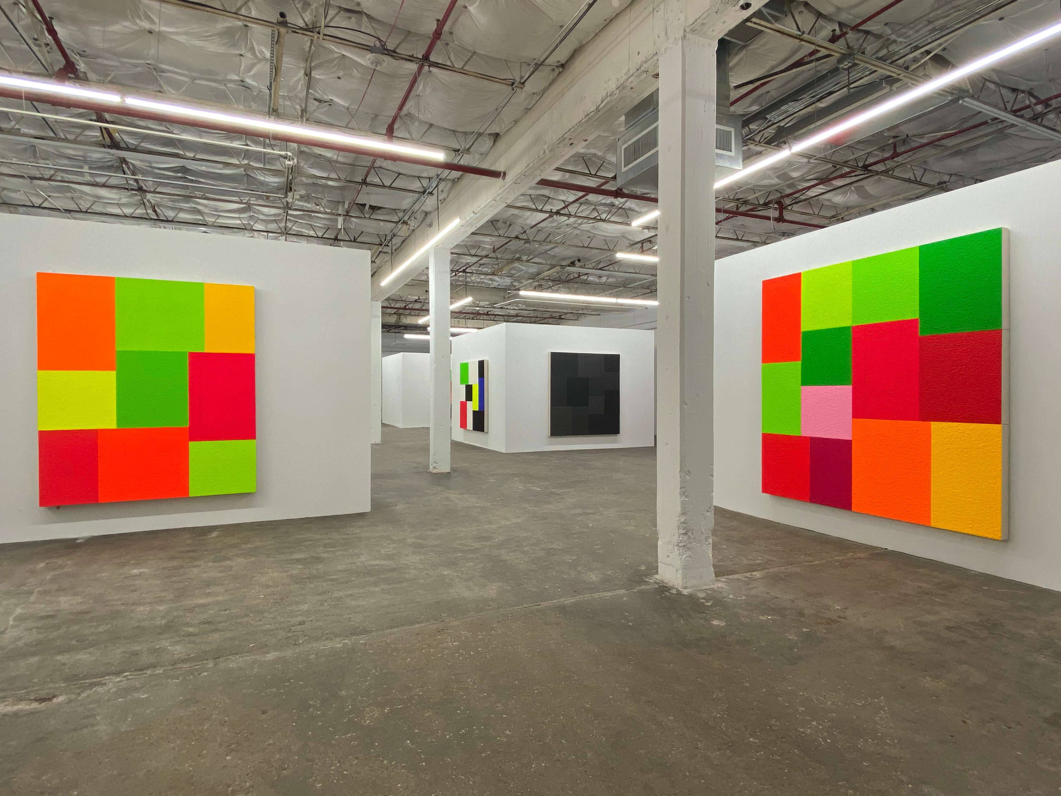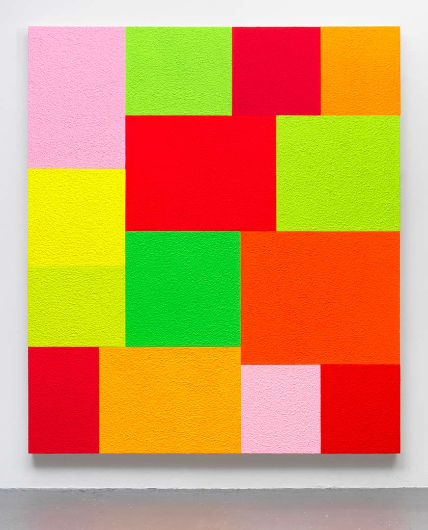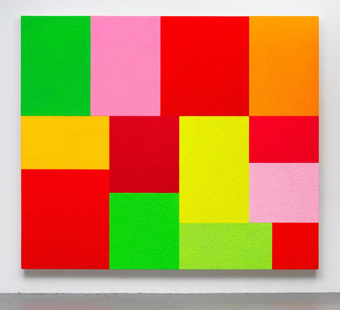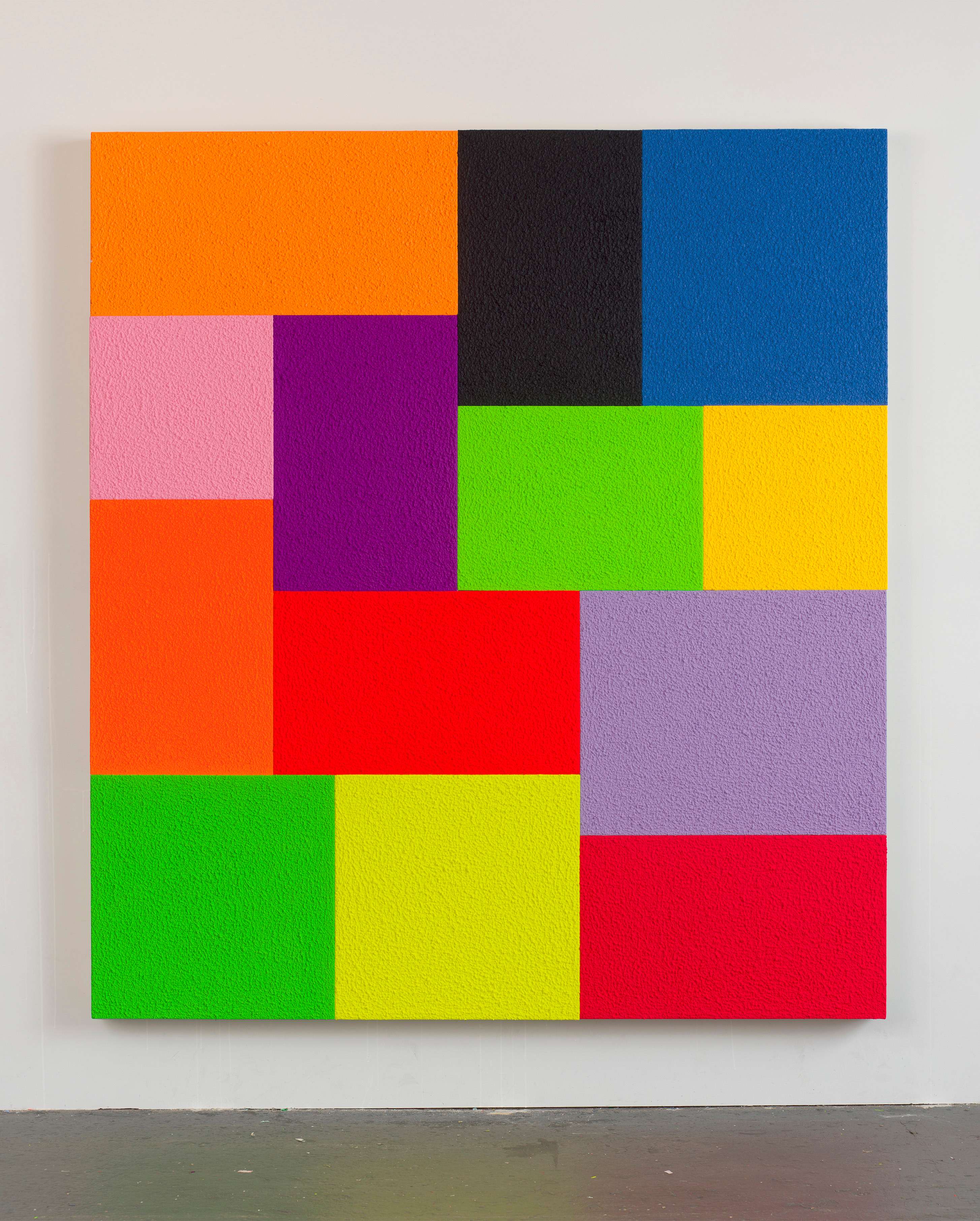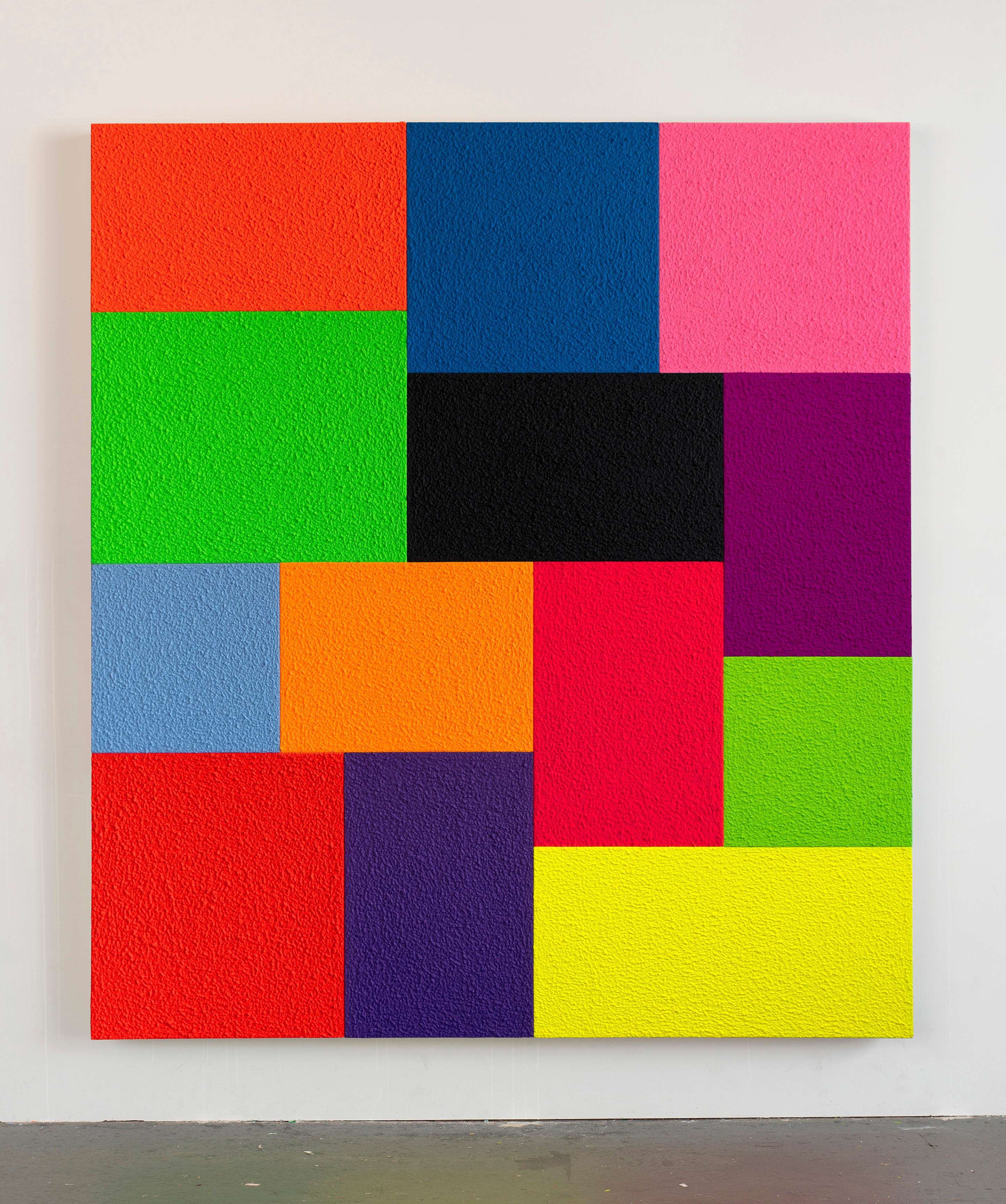 Spell, fluorescent acrylic, thirteen attached canvases, and Roll-A-Tex, 2021