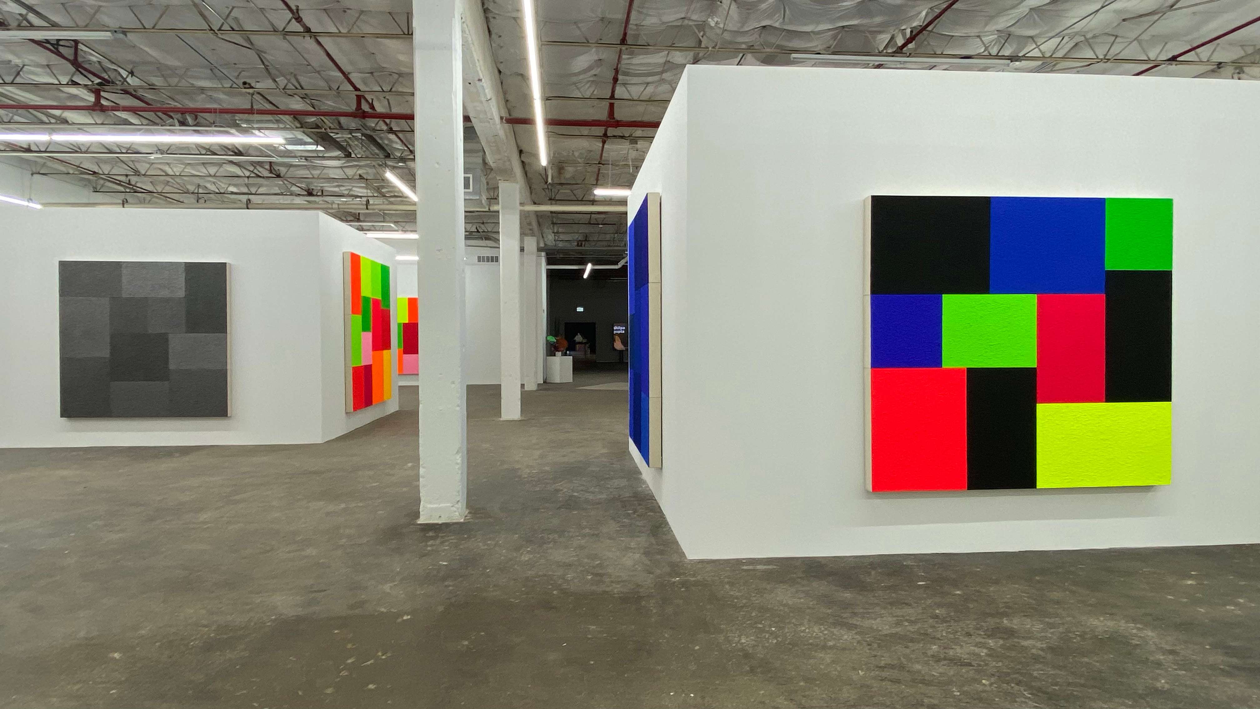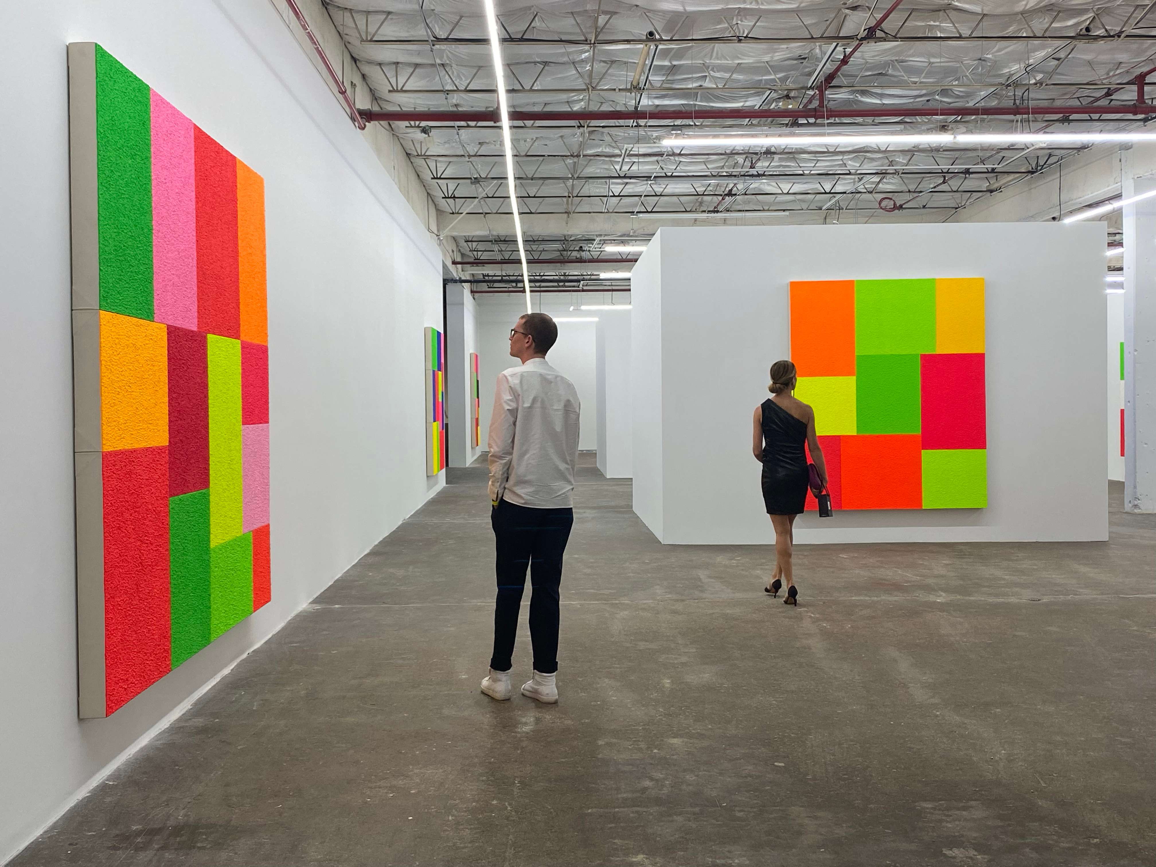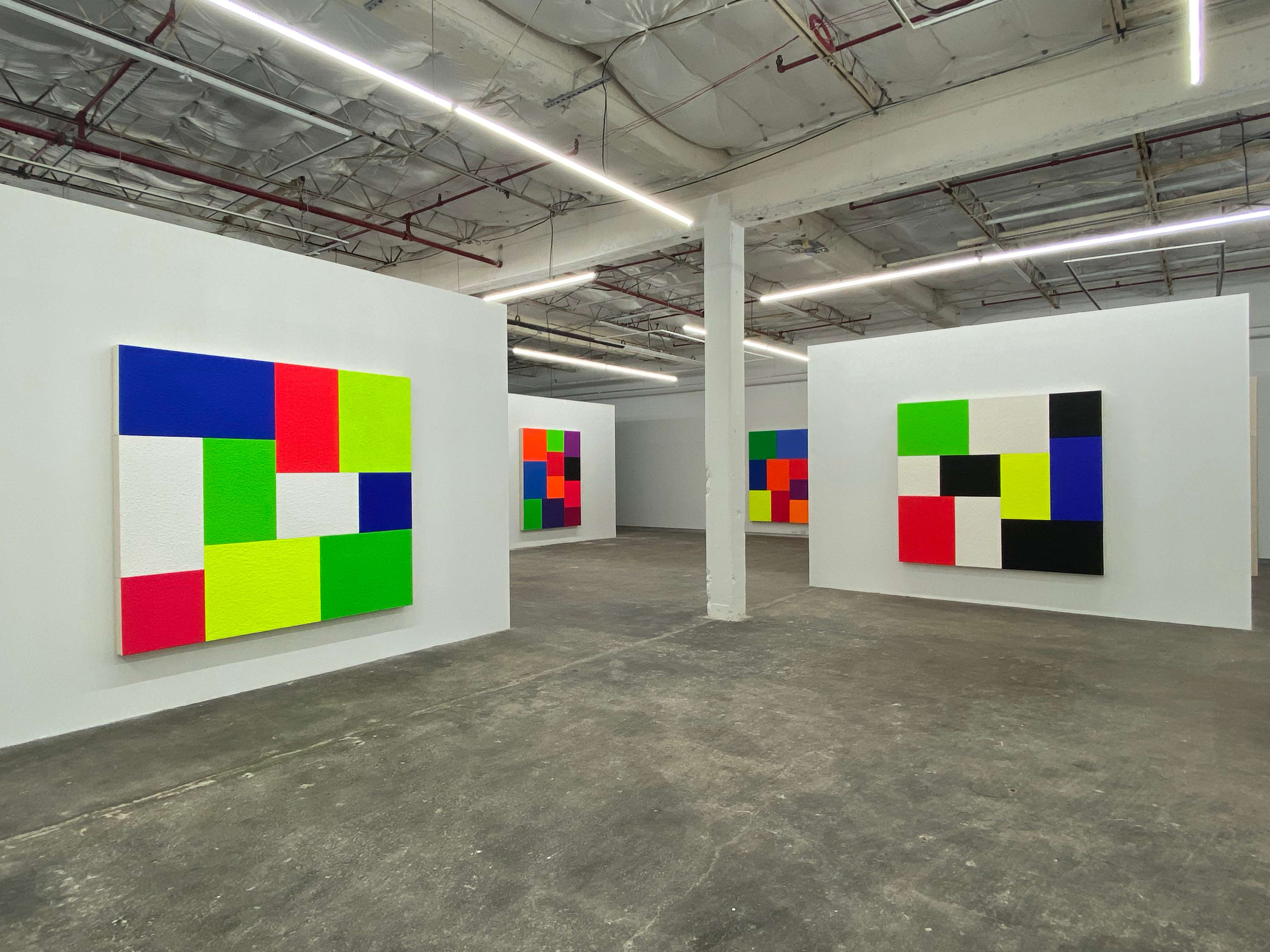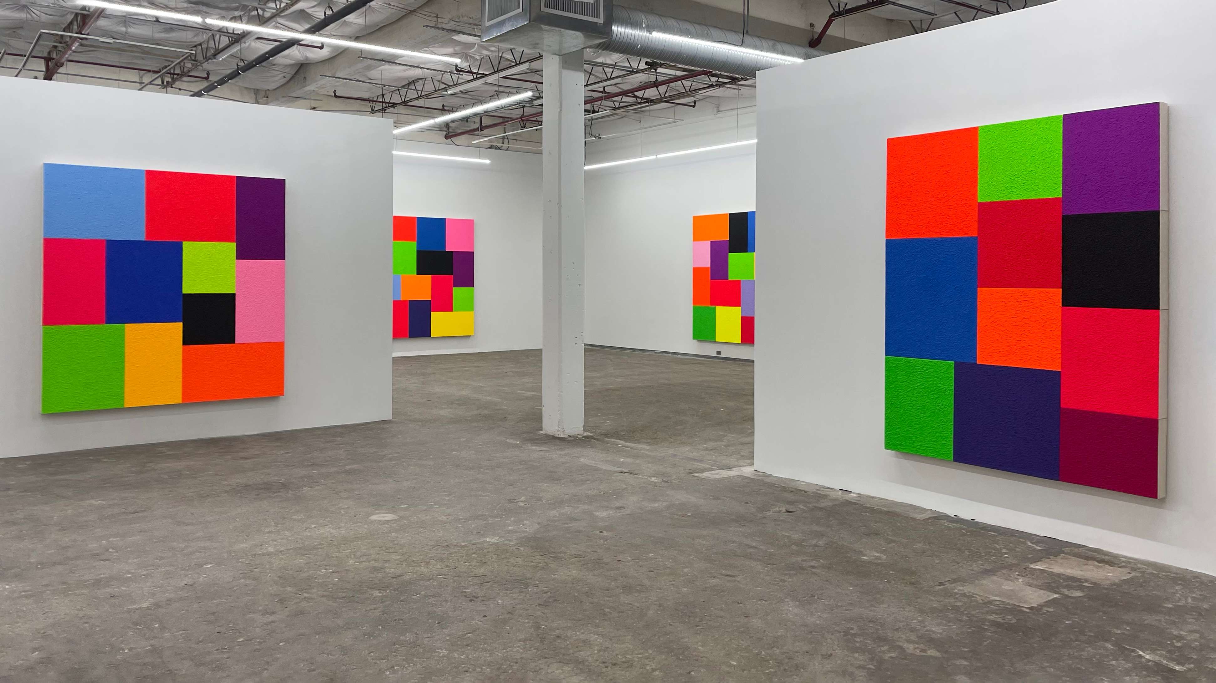 Spell, fluorescent acrylic, thirteen attached canvases, and Roll-A-Tex, 2021