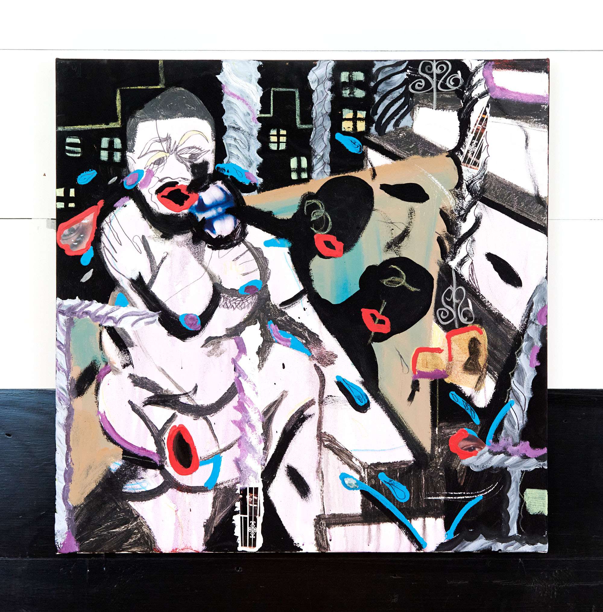 Jonathan Lyndon Chase, Anxiety attack At the front door, 2021 Acrylic paint, marker, glitter, collage on canvas 30 x 30” (76.2 x 76.2 cm)