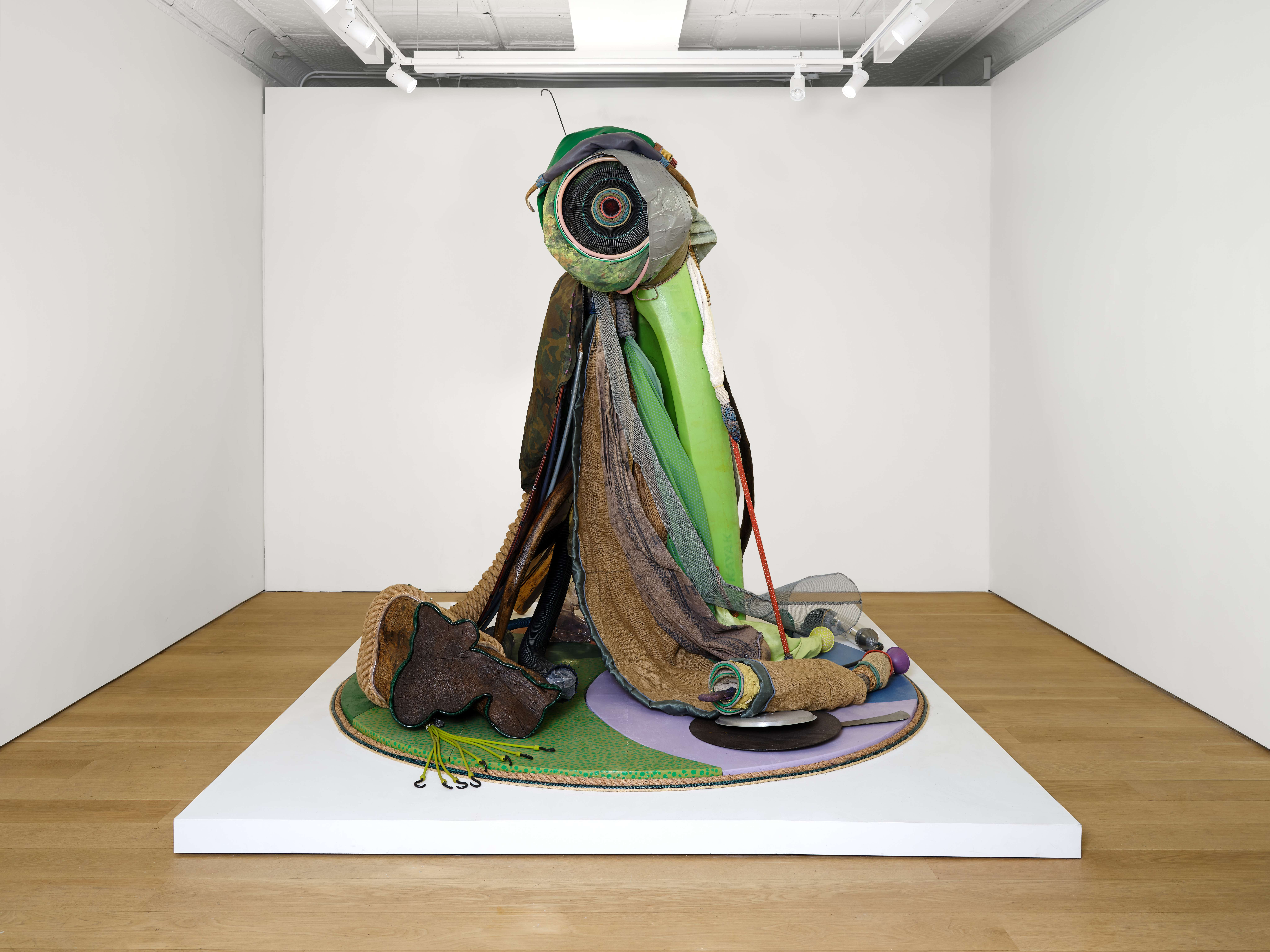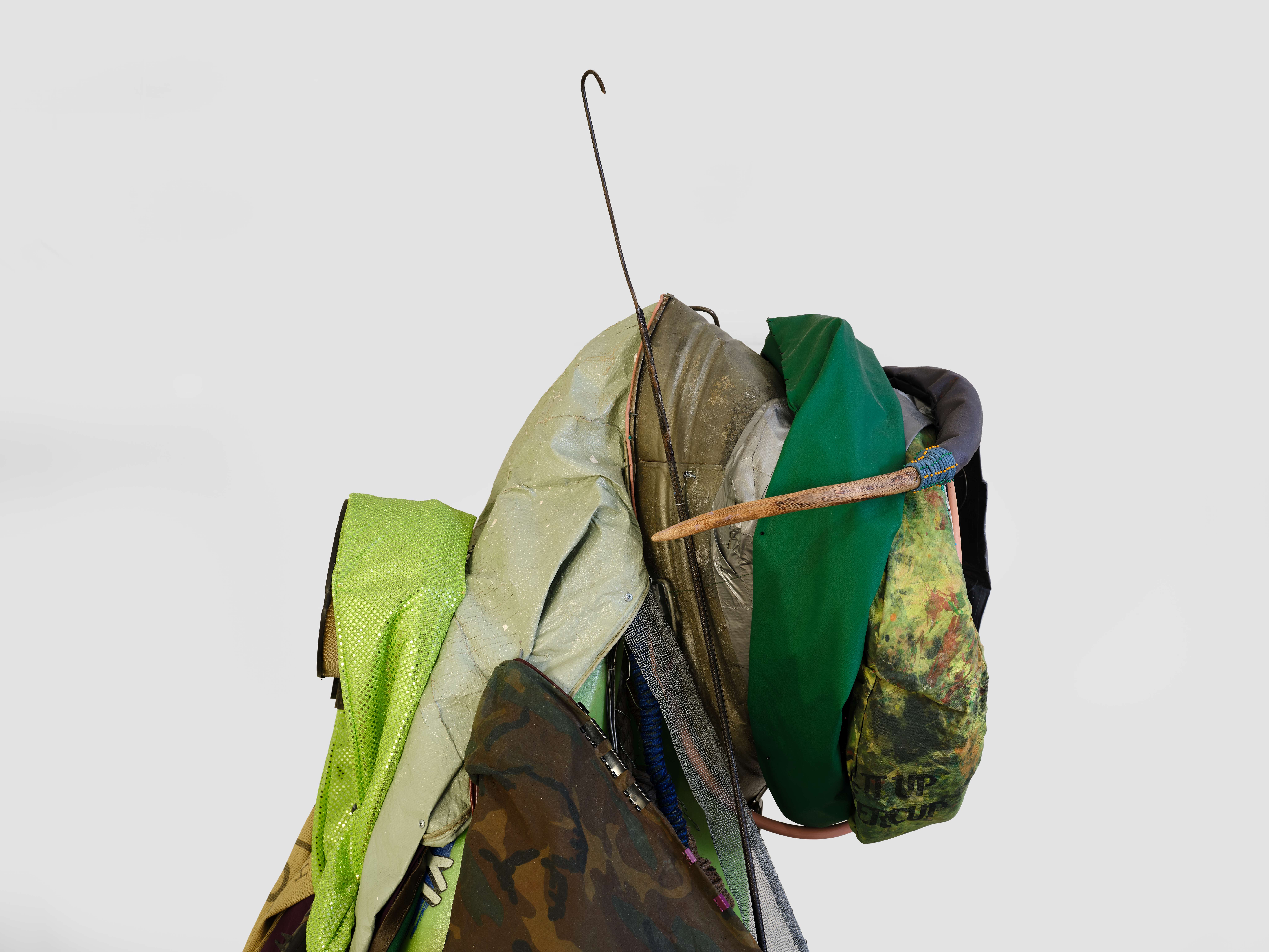Daniel Lind-Ramos, "The Green Guardian", 2024-2025. Green Kayak, fan, mixed fabric, rope, wood, plastic, crystal, sleeping bag, water hose, acrylic, iron rod, root, wooden trunk, iron disc, aluminium, plastic tubes, air filters, wire mesh, iron pipe, hessian. 108H x 96W in. (274.32H x 243.84W cm)