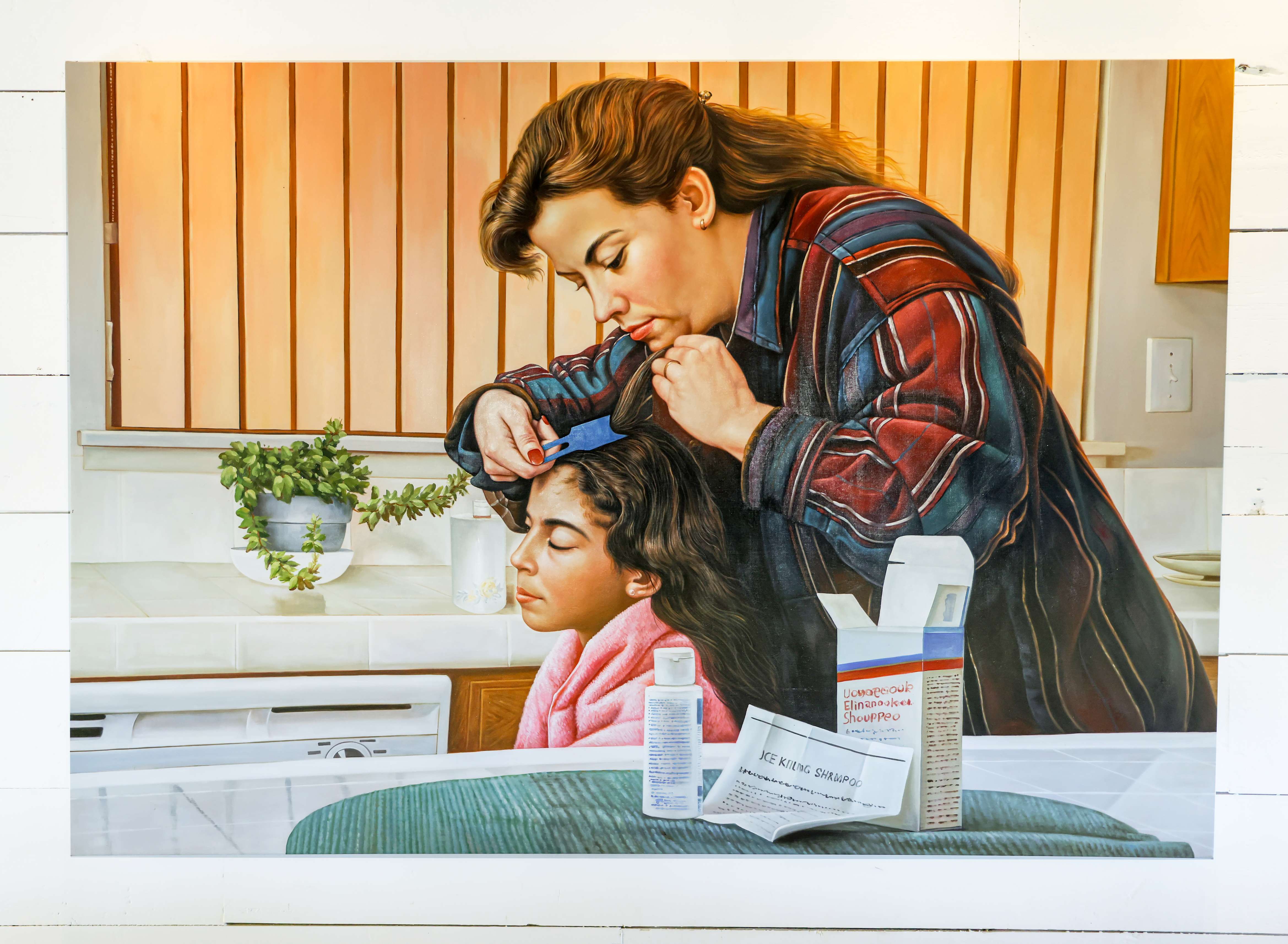 Jamian Juliano-Villani, A fucking lice killing machine, 2022. Oil on canvas 62 x 91 ”(157.5 x 231.1)