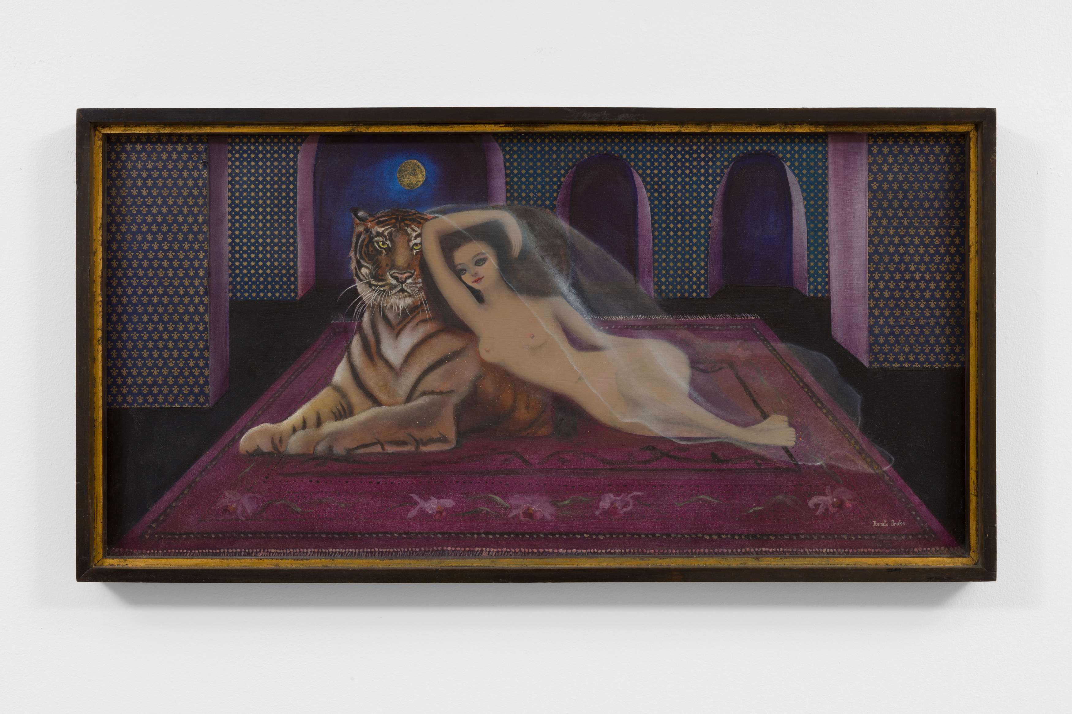 Renate Druks, Nude and Tiger, 1980. Oil on board, 15 x 30 inches (38.1 x 76.2 cm)