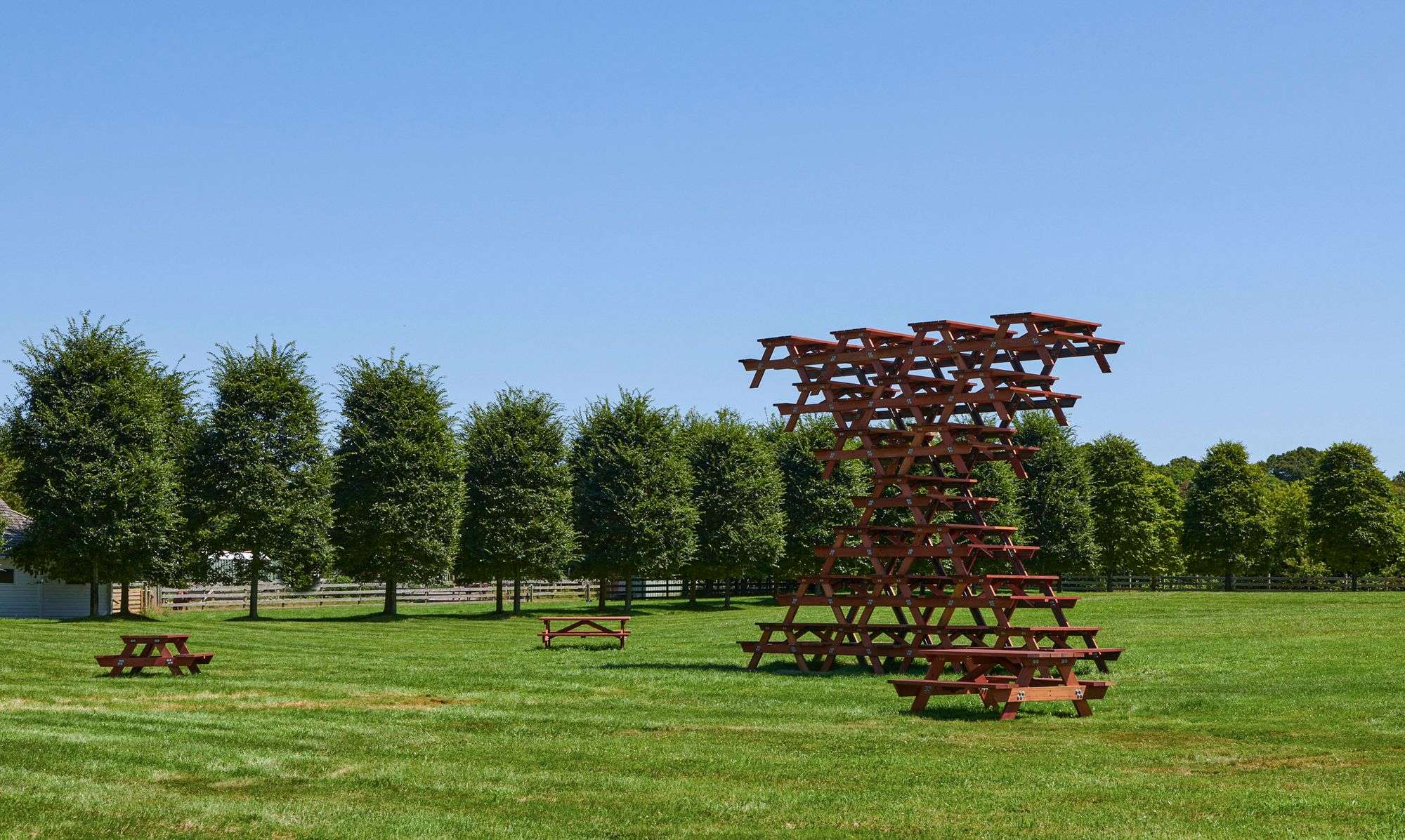 19 Picnic Table Stack (plus 3), 2023, Redwood, stainless steel, 210 x 236.75 in. (533.4 x 600.7 cm)