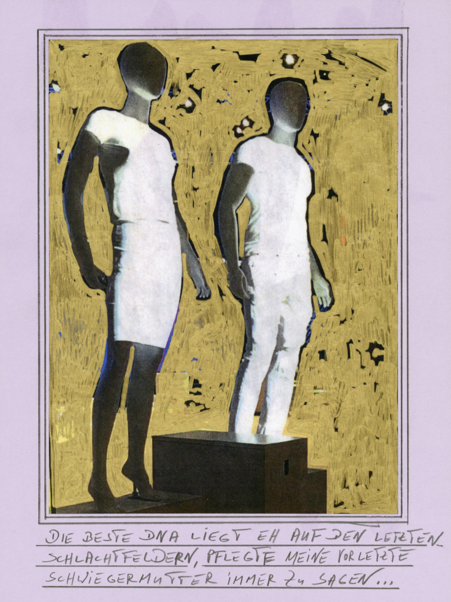 The best DNA is on the last battlefields anyway, my penultimate mother-in-law used to say....( Die beste DNA liegt eh auf den letzten Schlachtfeldern, pflegte meine vorletzte Schwiegermutter immer zu sagen…), 2017, collage, 12.4 x 13.6" (32 x 9.4 cm)
