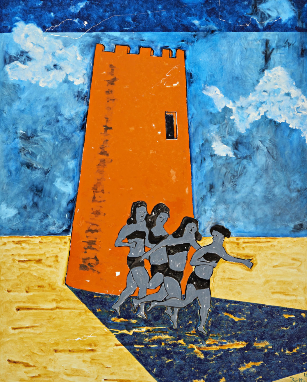 Gray Girls with Phallic Form (Graue Mädchen vor phallischer Form), 2018, oil on canvas, 59 x 47.2" (150 x 120 cm)
