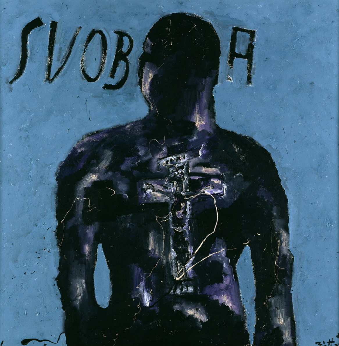 Prisoner, looking at the word "freedom" (Gefangener, das Wort »Freiheit« betrachtend), 1988, oil on canvas, 59 x 59.3" (150,1 x 150,5 cm)