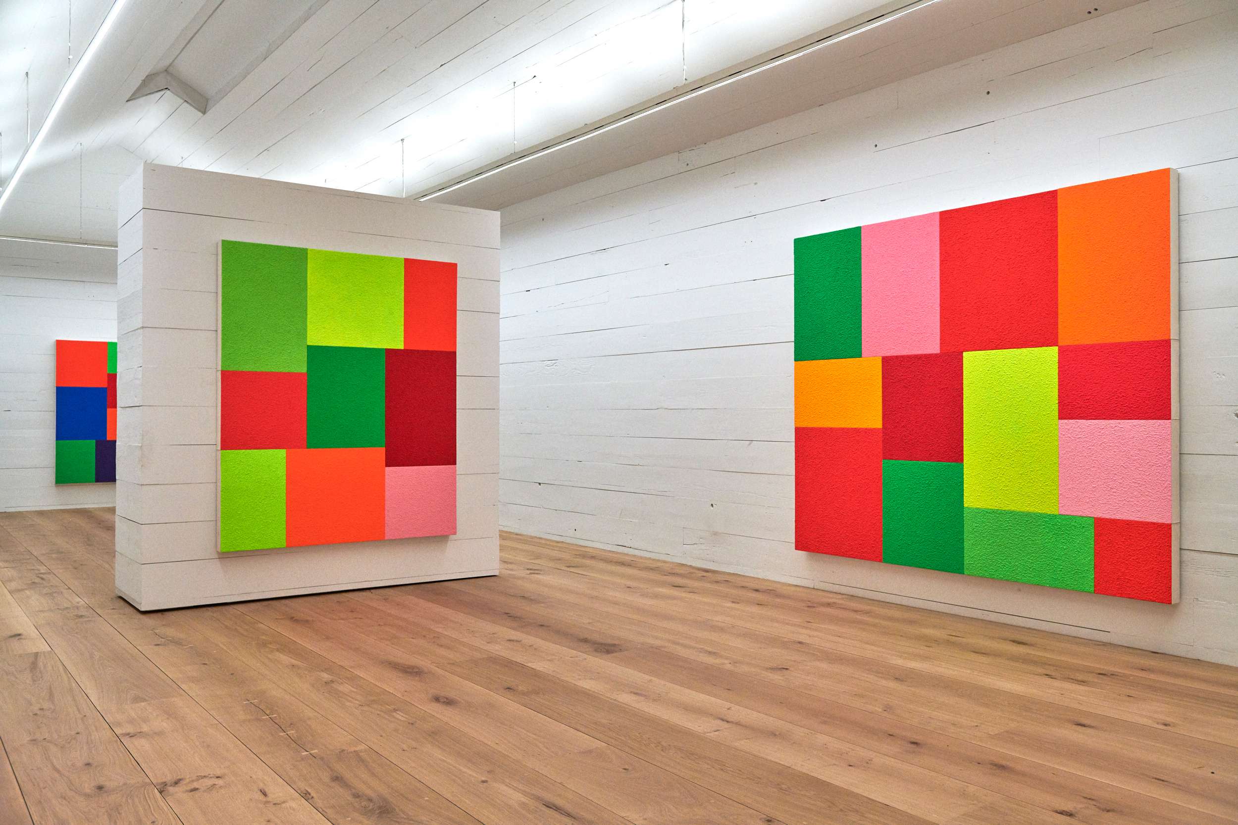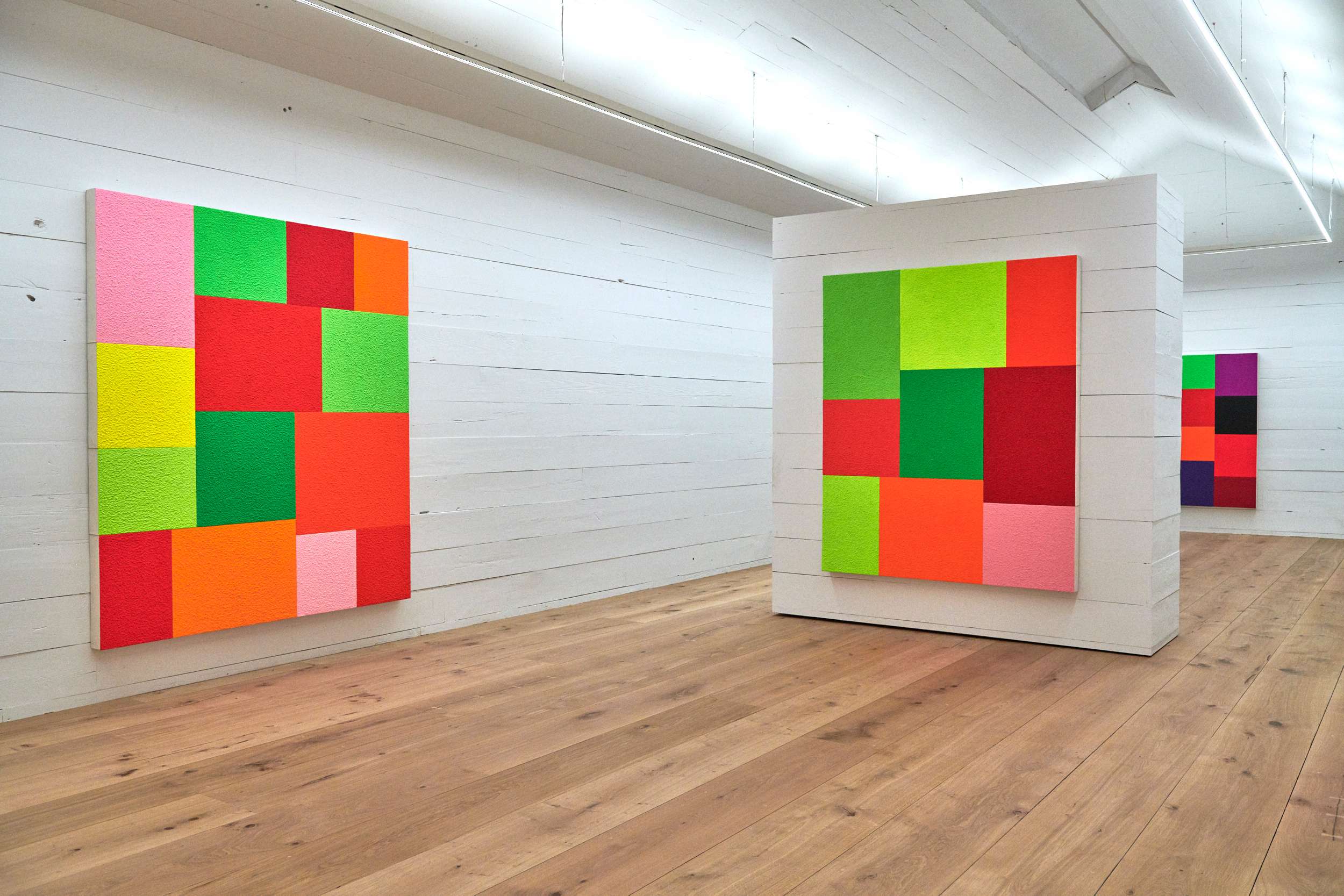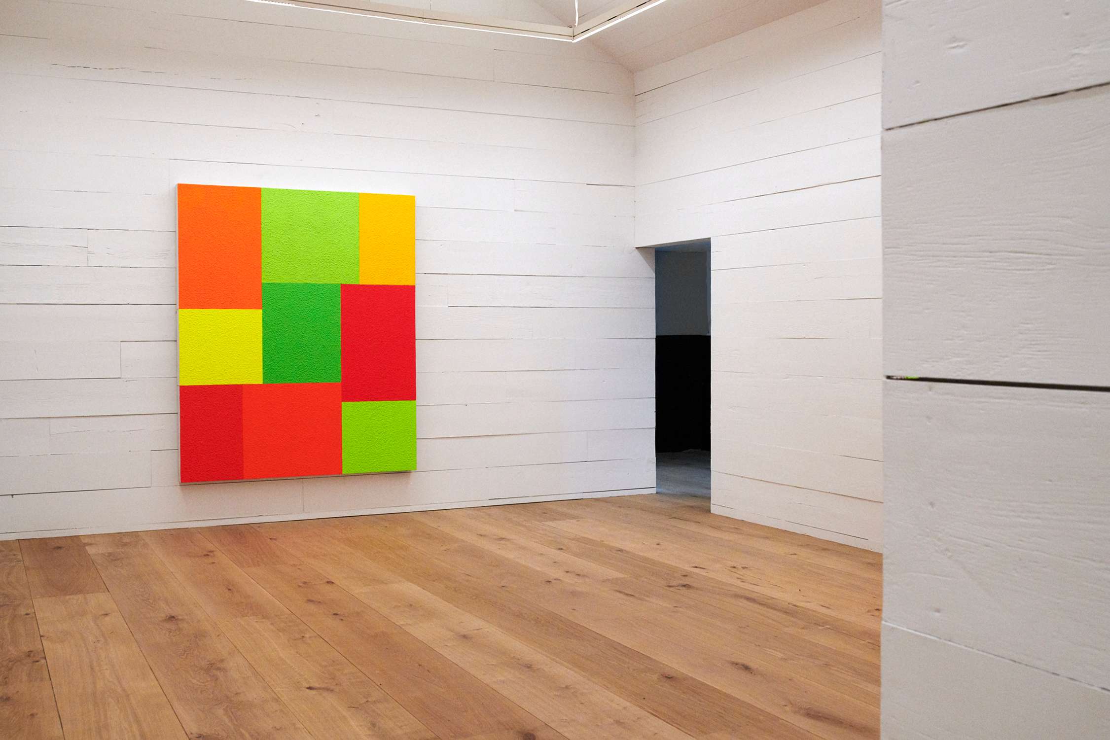 The Other Path, 2021. Acrylic, fluorescent acrylic, and Roll-a-Tex on 12 attached canvases, 82 x 76 inches
