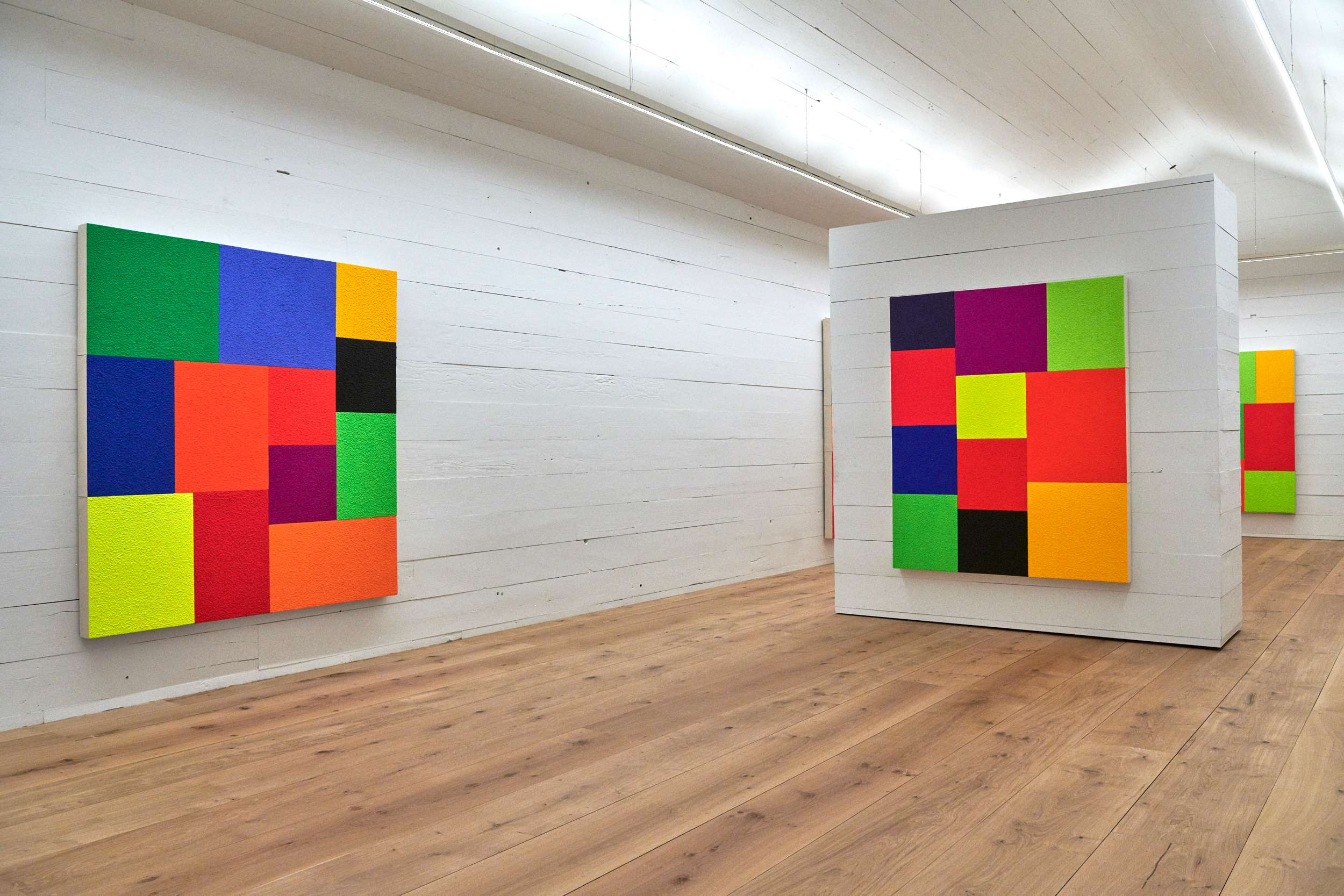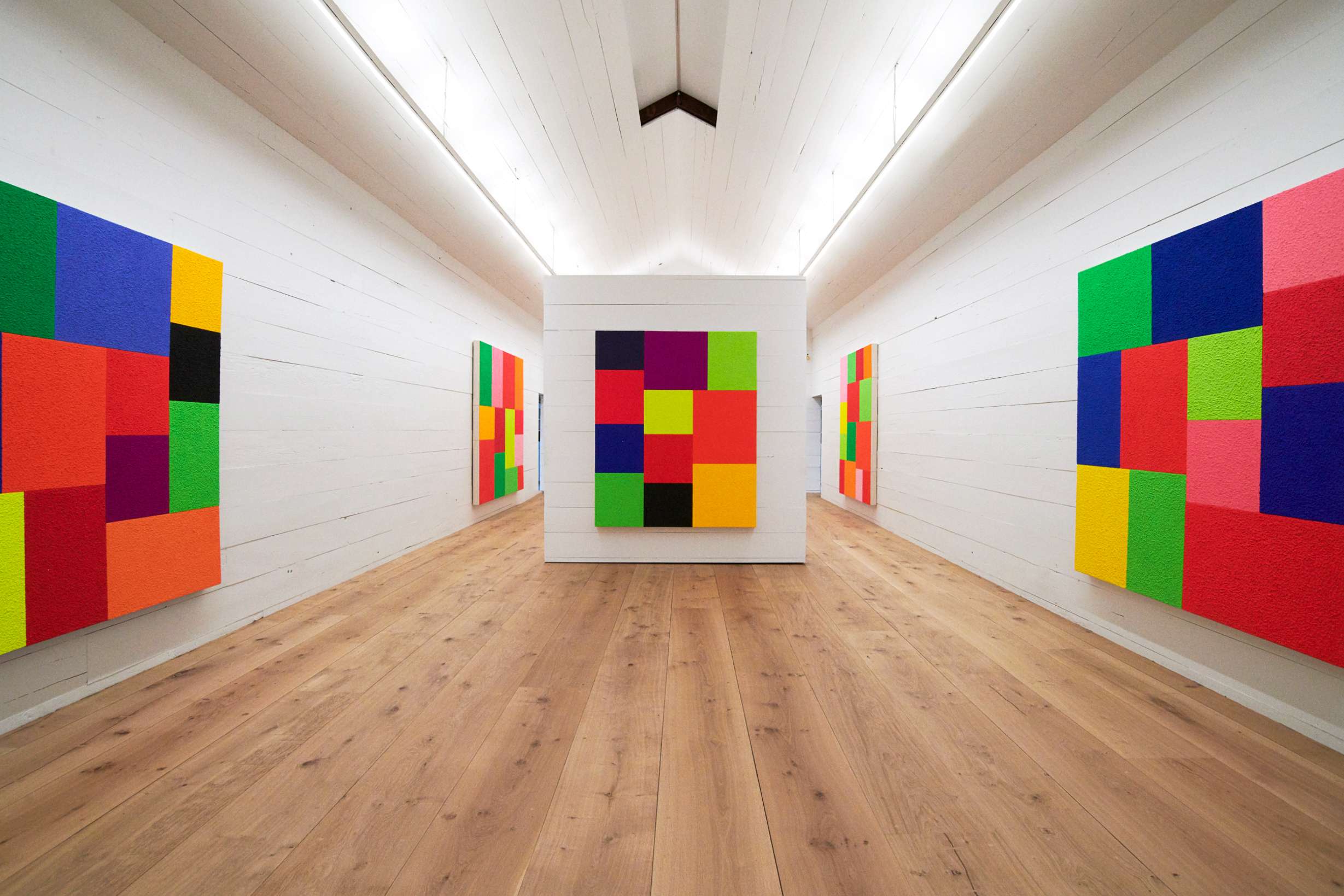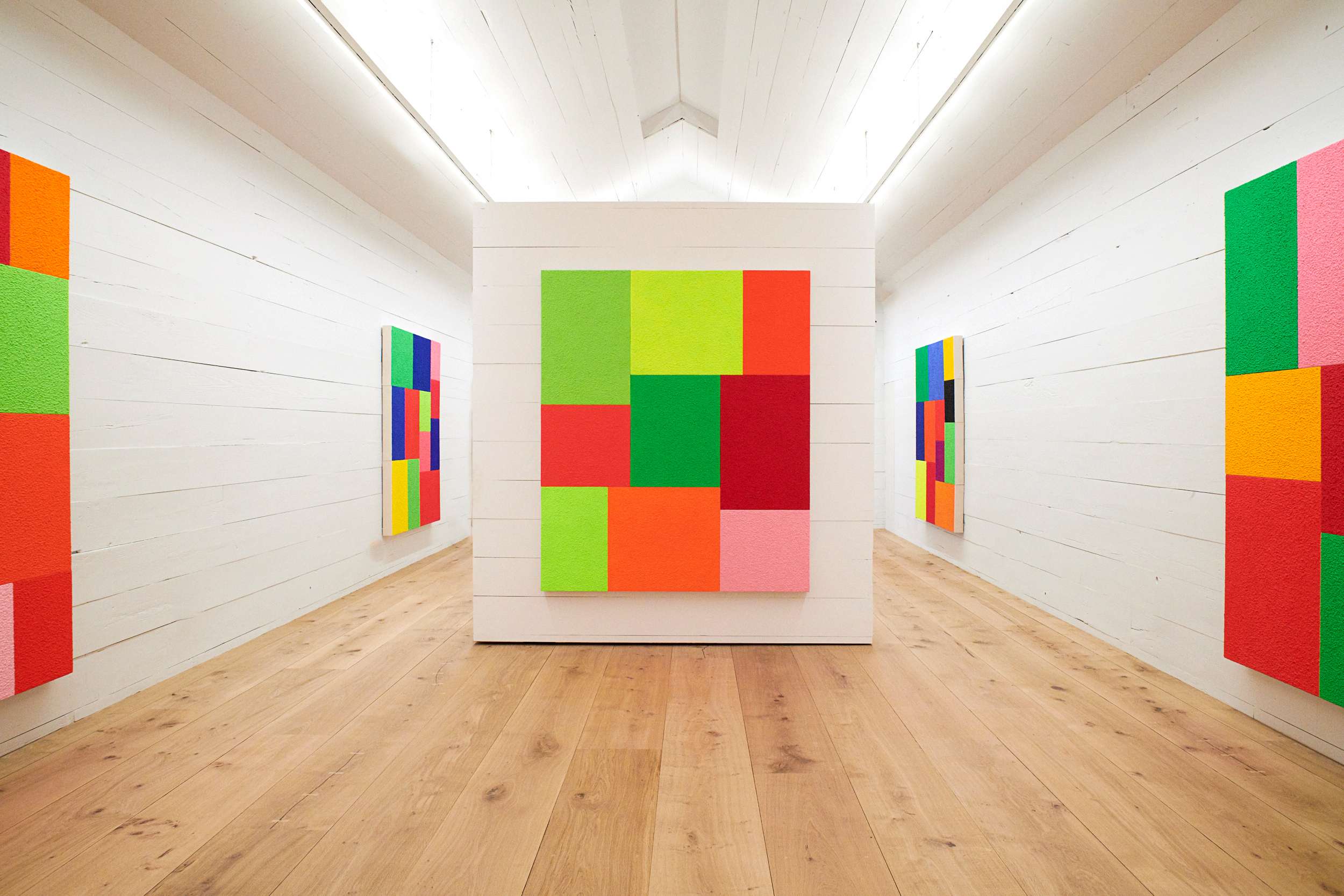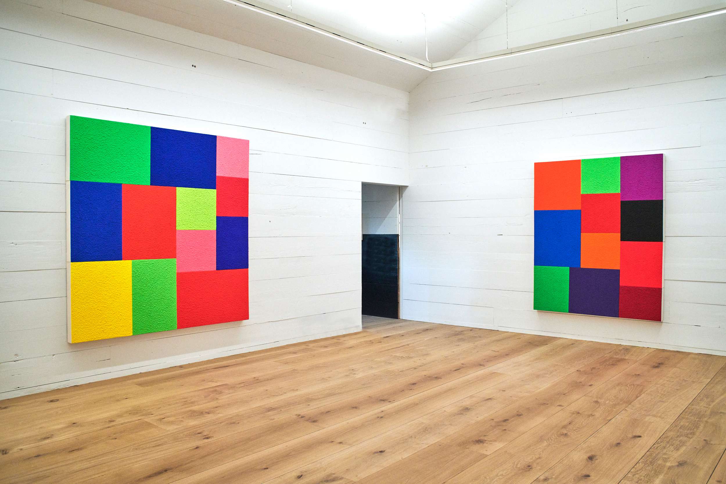 The Other Path, 2021. Acrylic, fluorescent acrylic, and Roll-a-Tex on 12 attached canvases, 82 x 76 inches