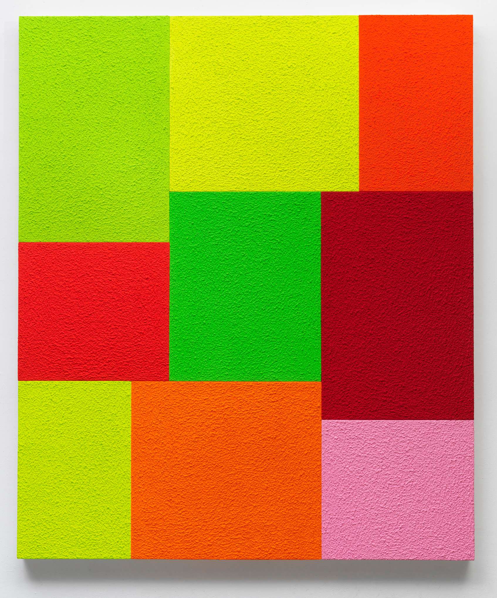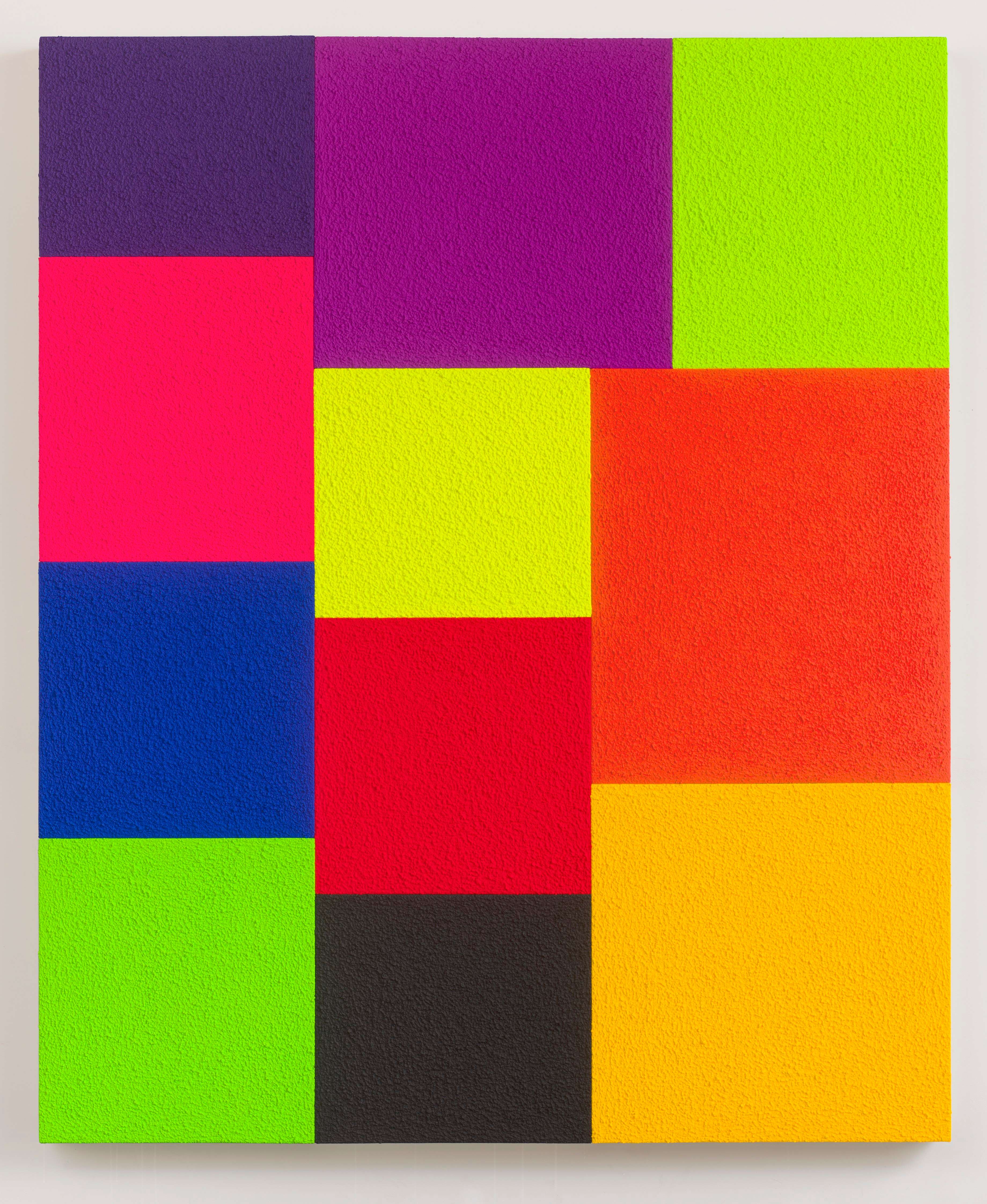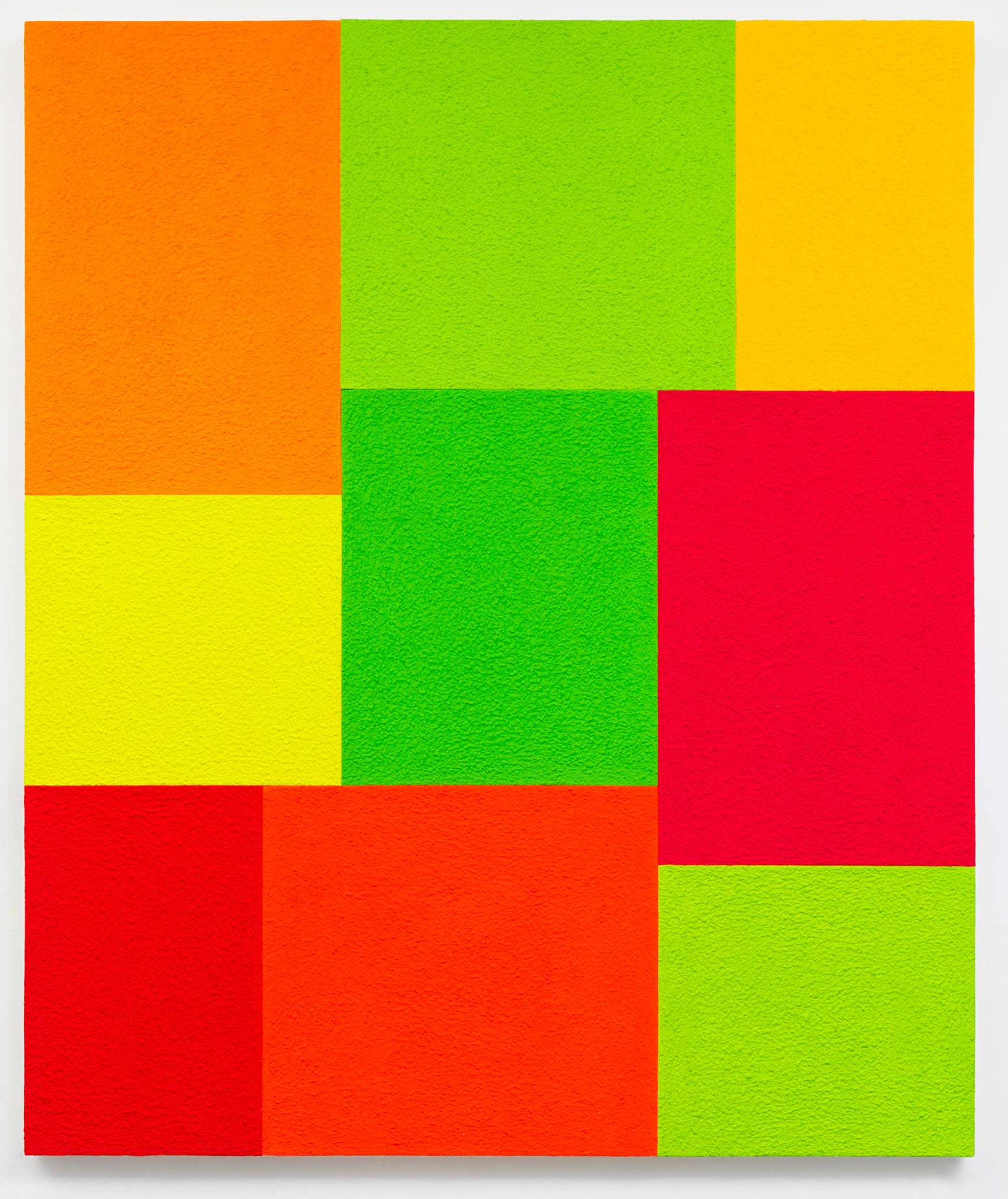 Regression, 2015. Acrylic, fluorescent acrylic, and Roll-a-Tex on 9 attached canvases, 86 x 72 inches