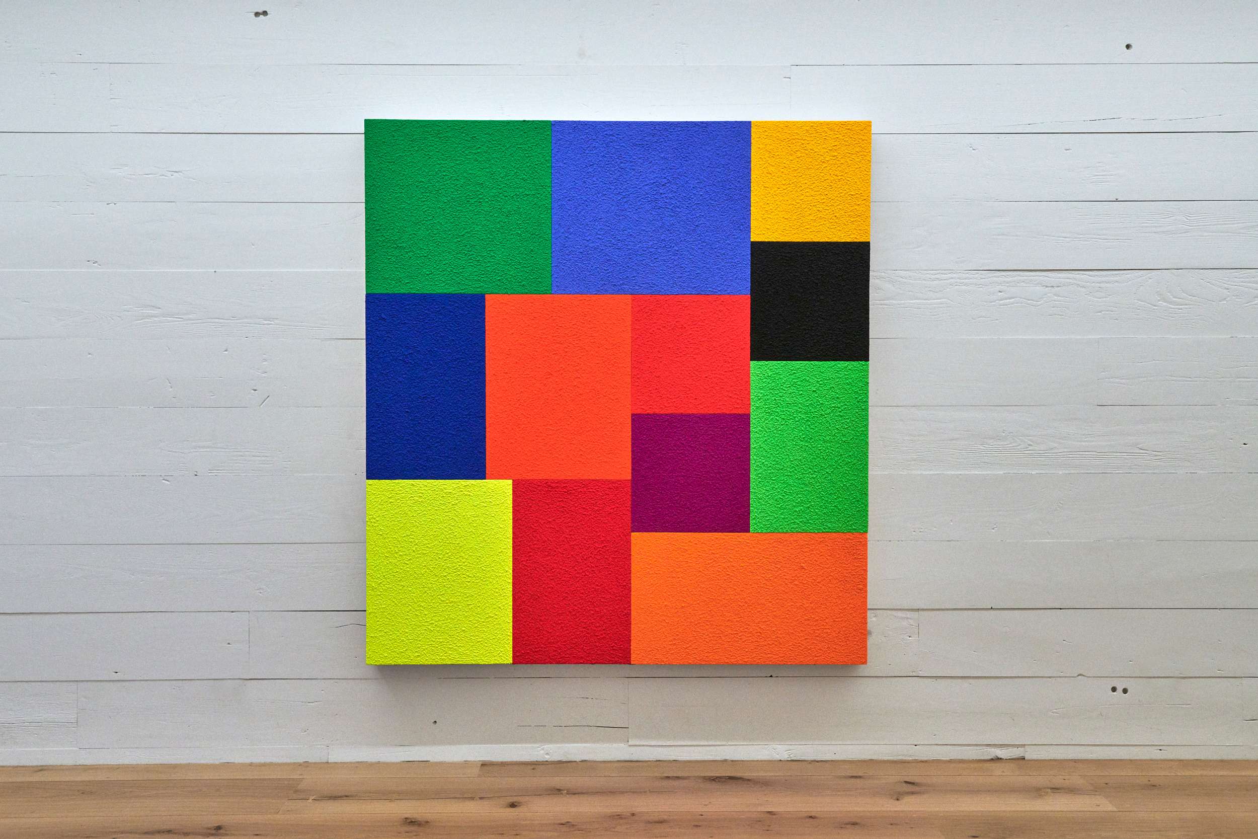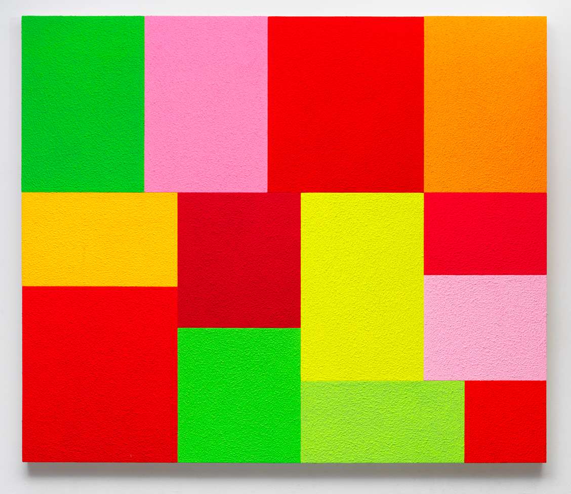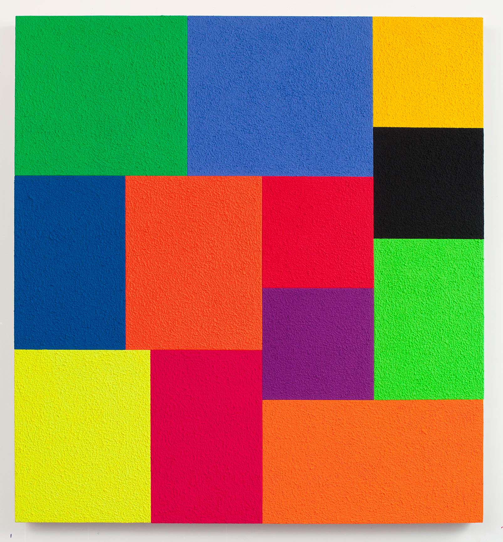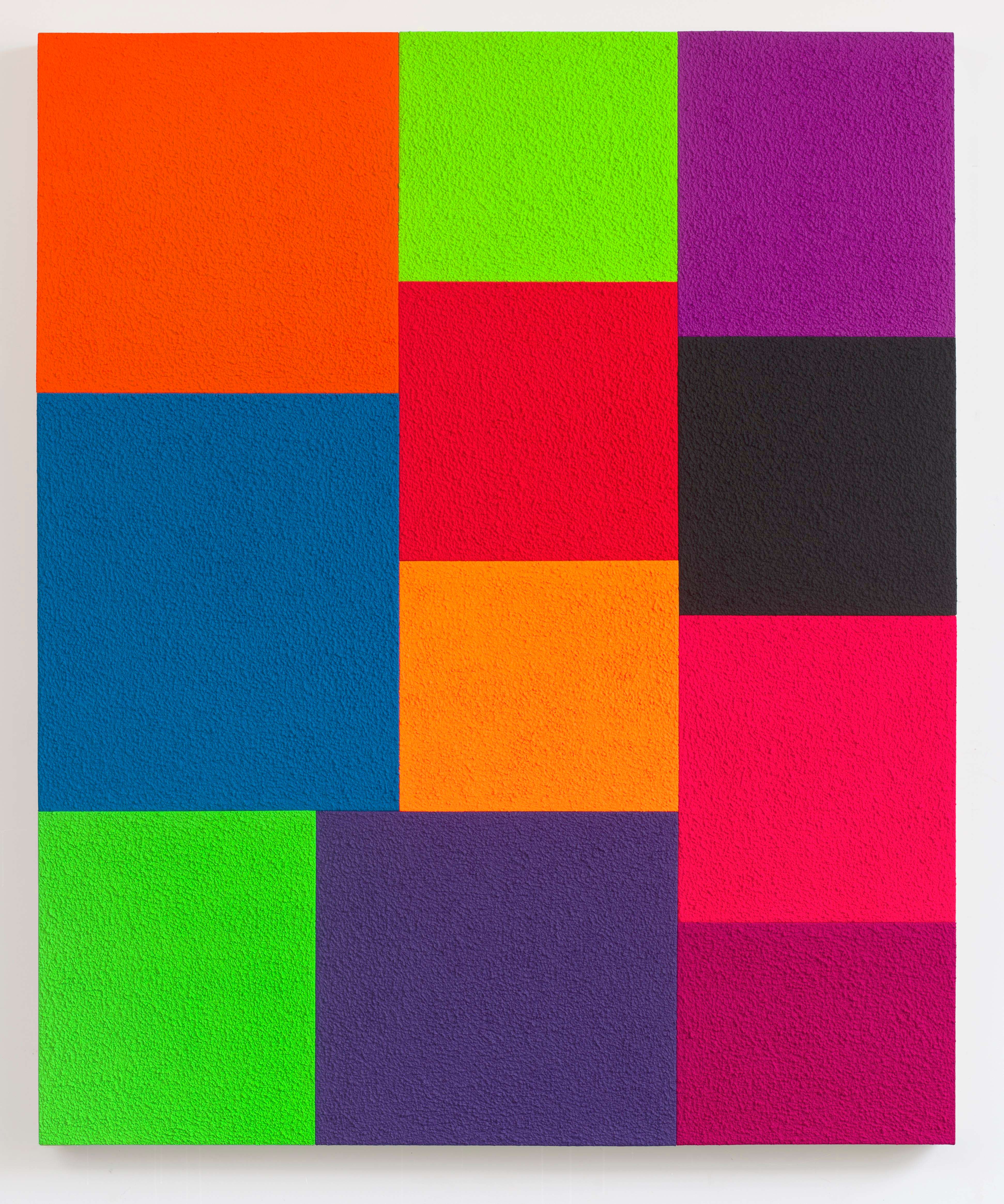 Regression, 2015. Acrylic, fluorescent acrylic, and Roll-a-Tex on 9 attached canvases, 86 x 72 inches